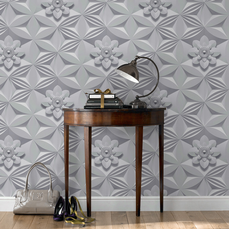 Description: A table with a lamp and a pair of shoes on it next to a wallpapered wall with a flower design.