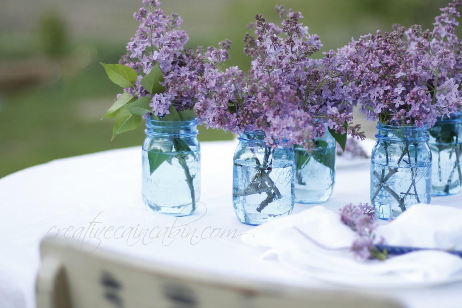 Description: A table with three mason jars with flowers in them on it and a napkin on the table next to them.