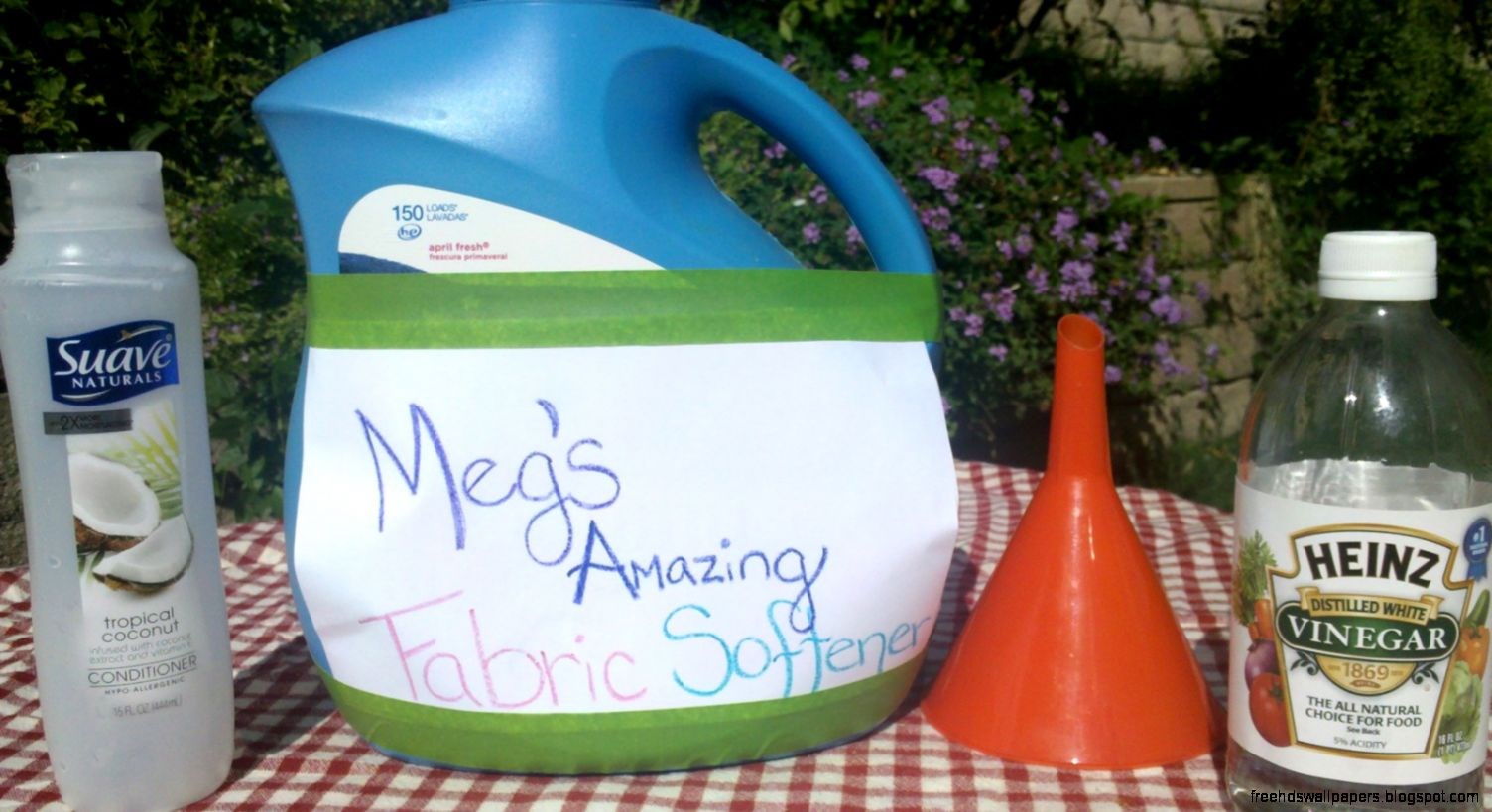 Description: A table with a sign and some bottles of cleaner and a bottle of vinegar on it and a bottle of vinegar.