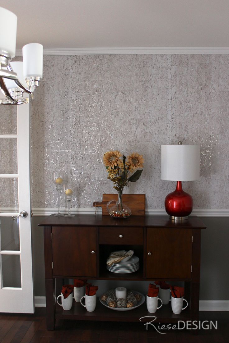 Description: A table with a vase of flowers and plates on it in a room with a ladder and a lamp.