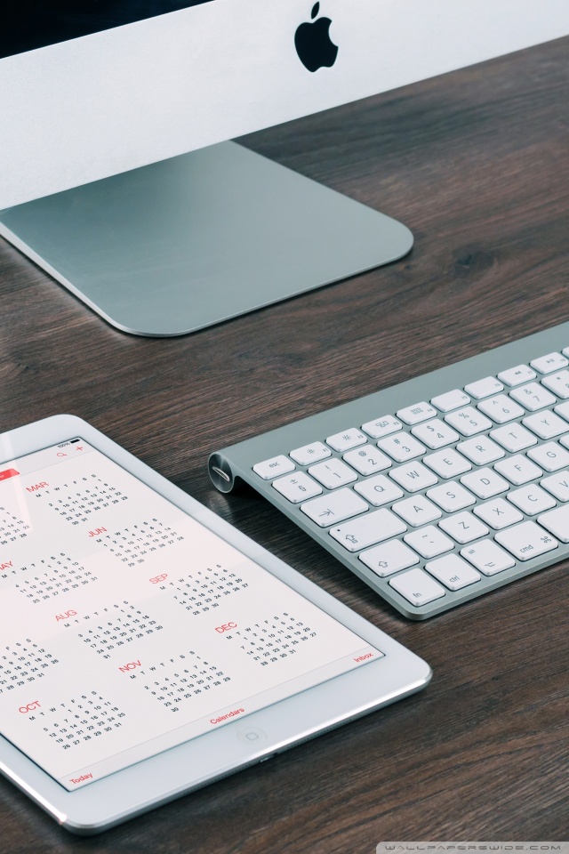 Description: A tablet and a keyboard on a desk with a calendar on it and a mouse and keyboard on the desk.