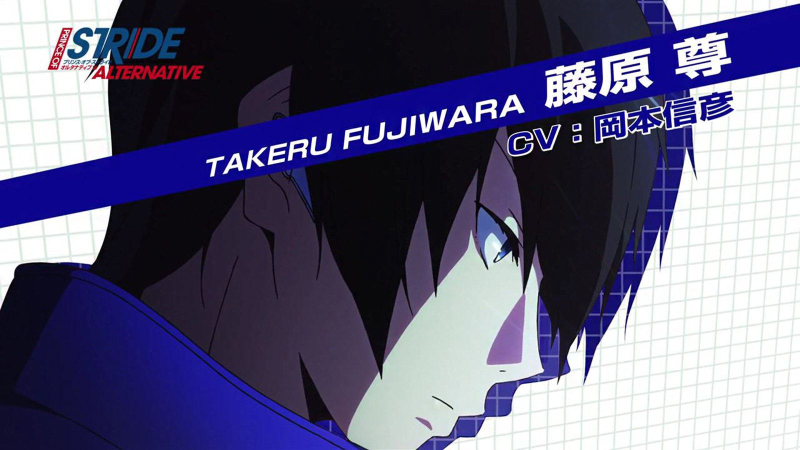 Description: A anime character with a blue shirt and black hair and a blue collar and tie with the words takeru fuwaara written in japanese.