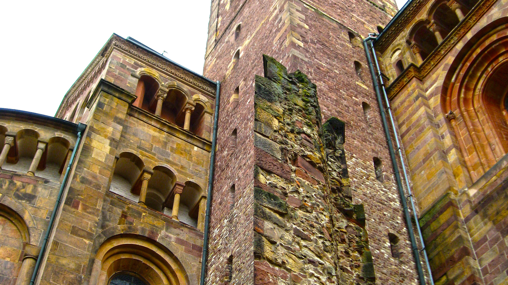 Description: A tall brick building with a clock on the side of it's face and a clock on the side of the building.