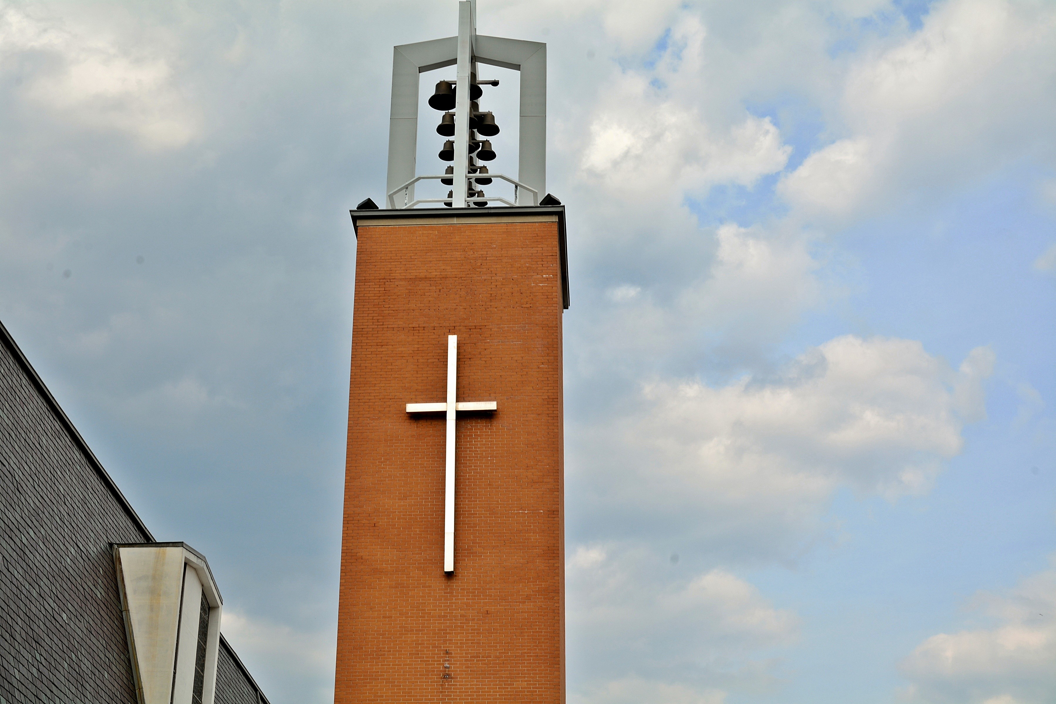 Description: A tall brick tower with a cross on top of it and a clock on the top of it.