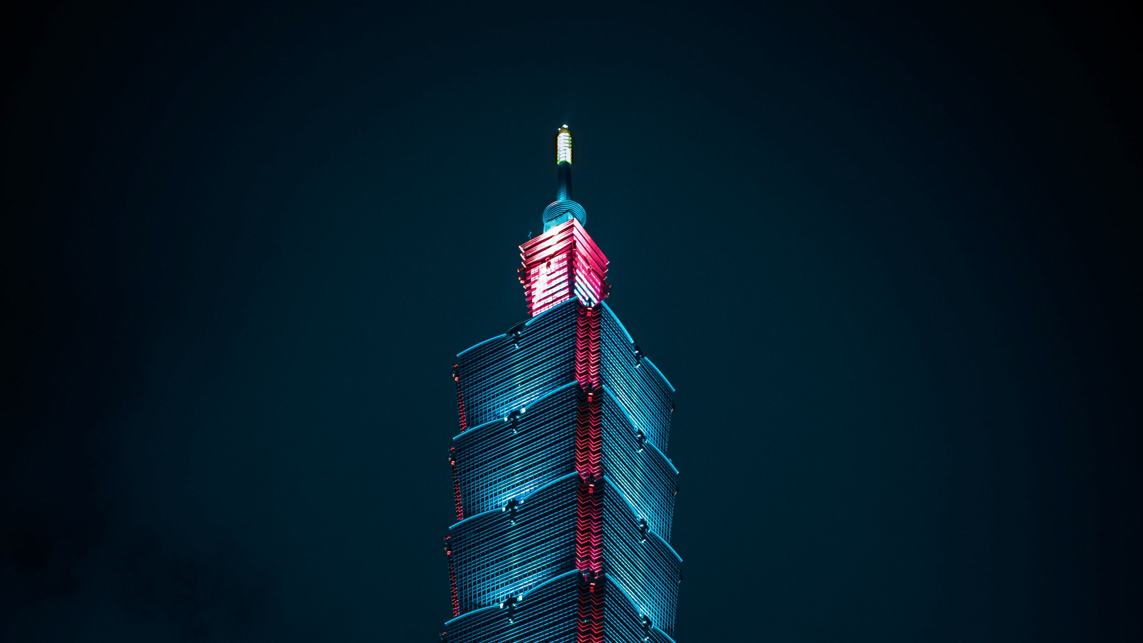 Description: A tall building with a red and white flag on top of it's side at night time.