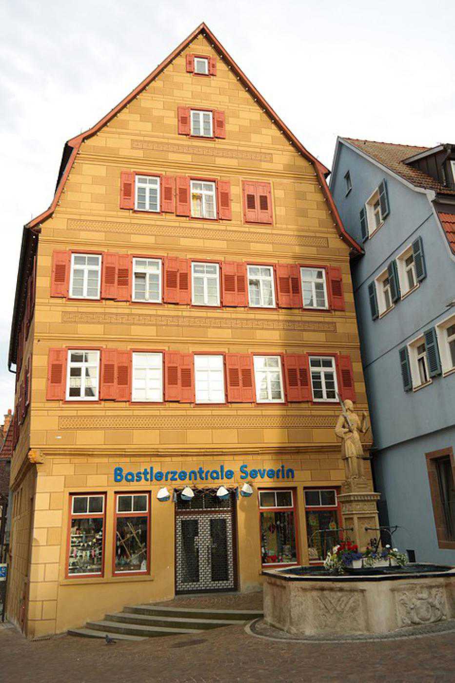 Description: A tall building with a fountain in front of it and a statue of a man on the outside of it.