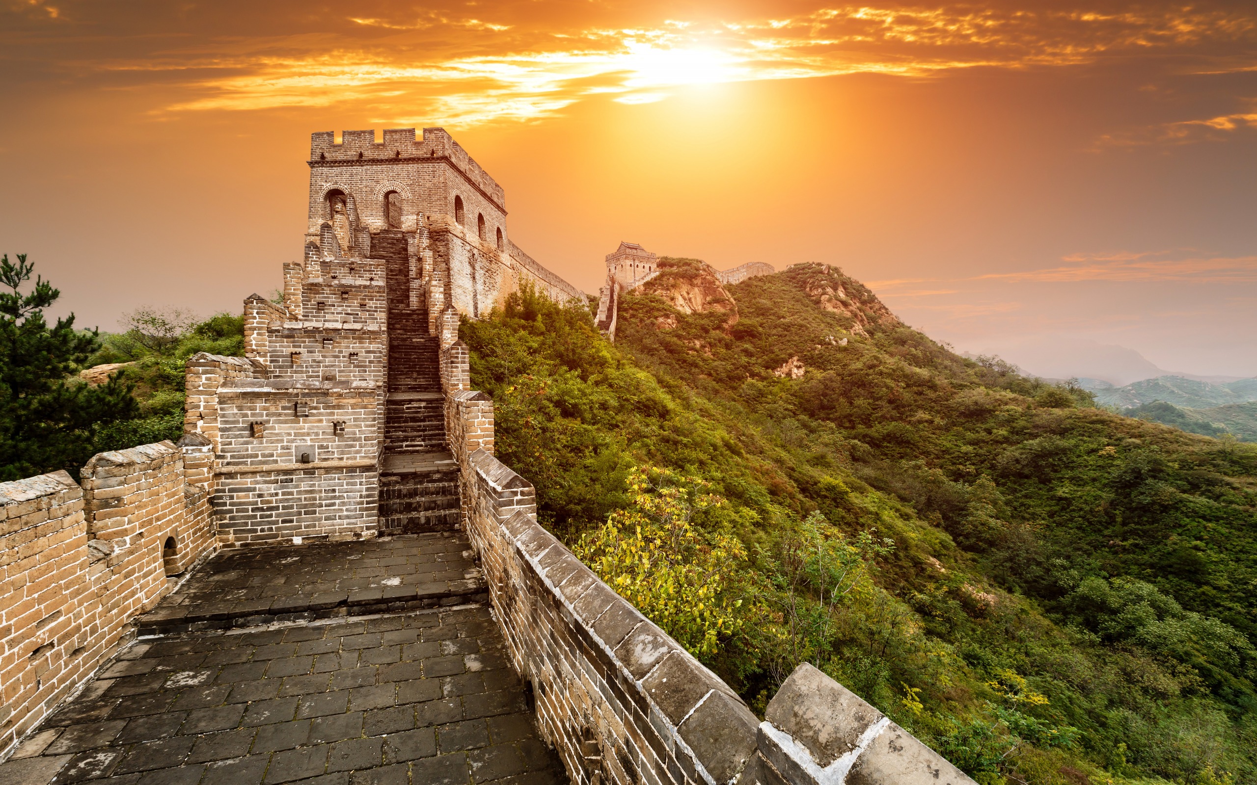 Description: A very tall building on a hill with a sunset in the background and a few trees on the side.