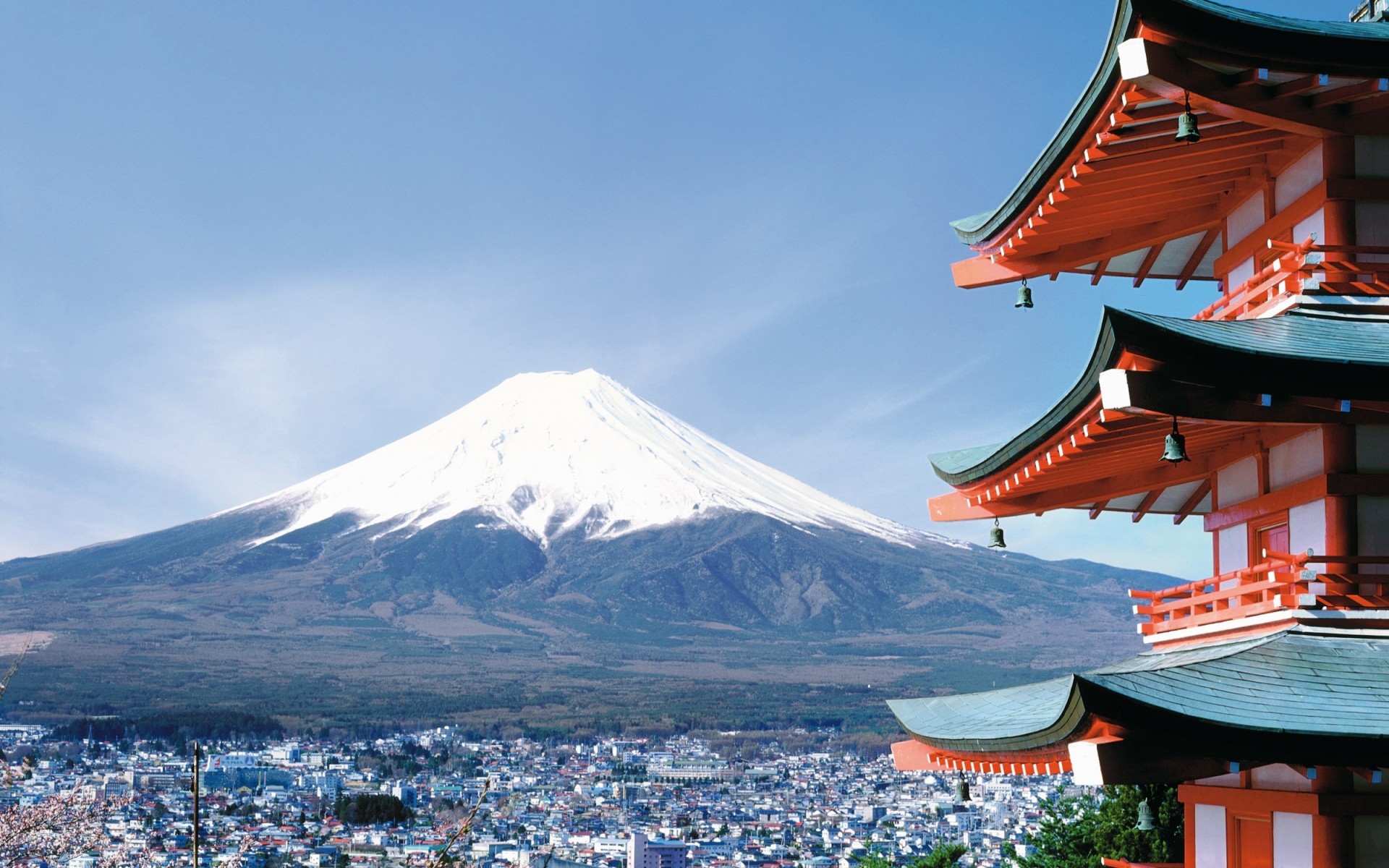Description: A tall building with a mountain in the background and a blue sky in the foreground with a white snow capped mountain in the distance.