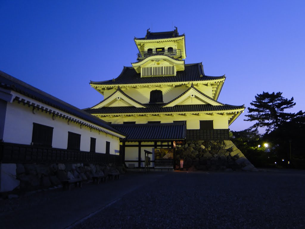 Description: A tall building with a tower at night time with lights on it's sides and a clock on the top.