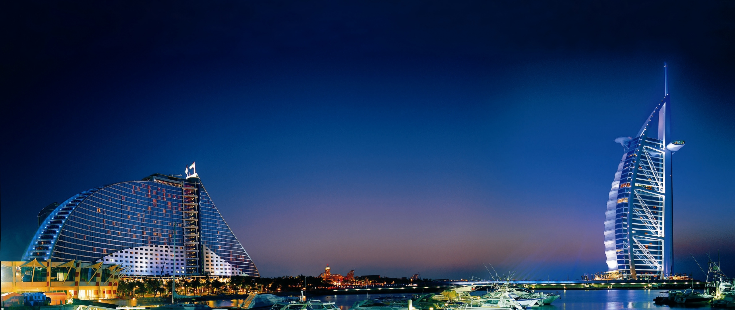 Description: A very tall building sitting next to a body of water at night time with boats in the water below.