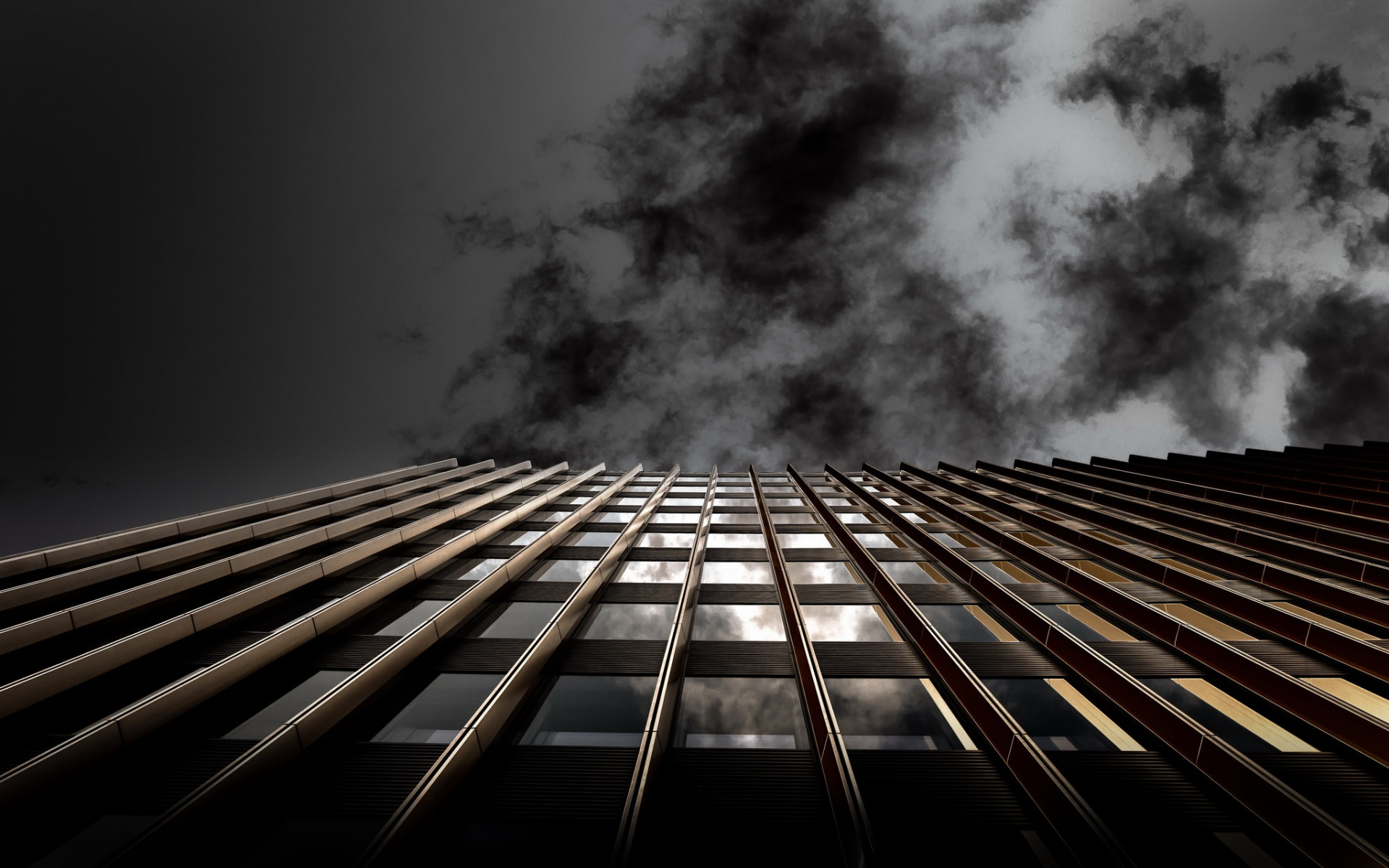 Description: A tall building with a lot of windows and smoke coming out of it's sides and a sky background.