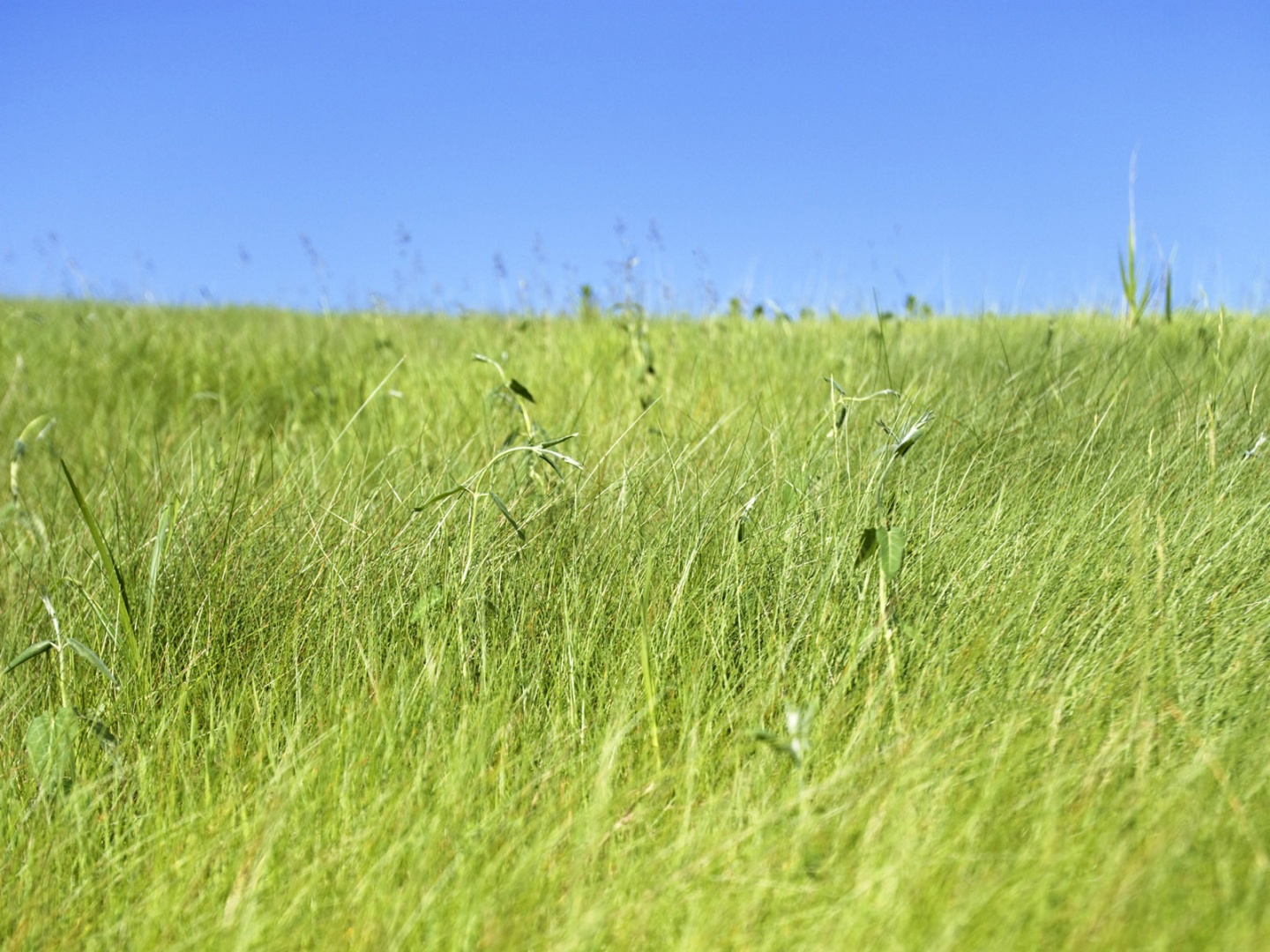 Description: A field of tall grass with a blue sky in the background and a bird flying in the distance in the foreground.