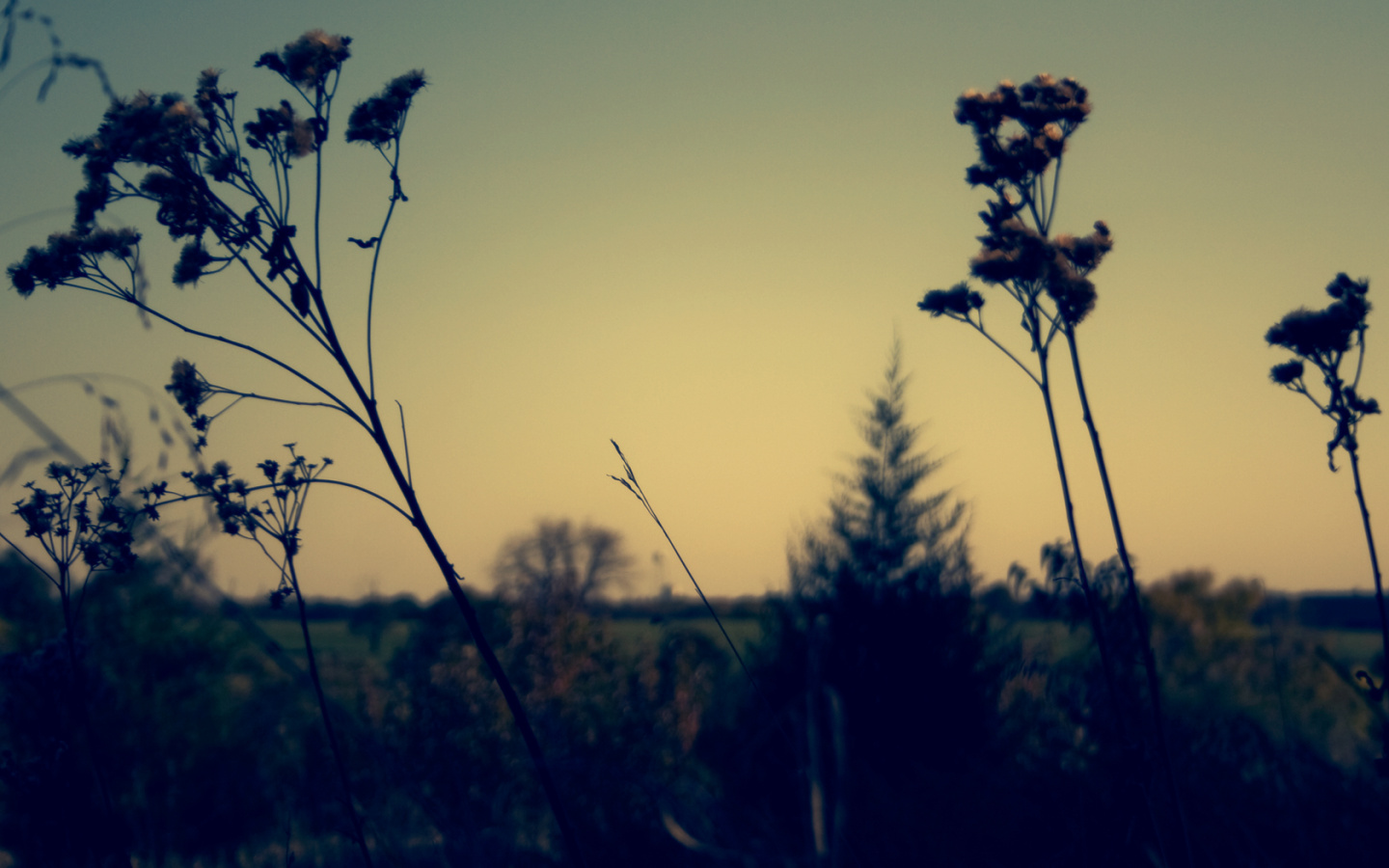 Description: A field with some tall grass and flowers in it at sunset or dawn with a sky background and a few trees.