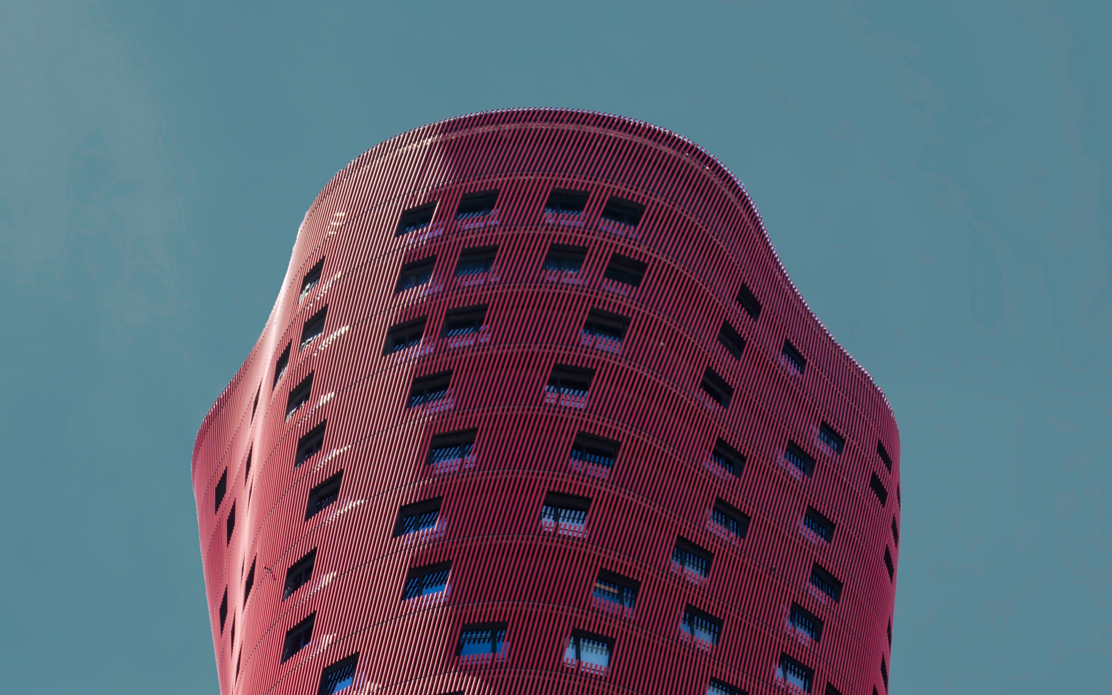 Description: A tall red building with a sky background and a plane flying overhead in the sky above it.