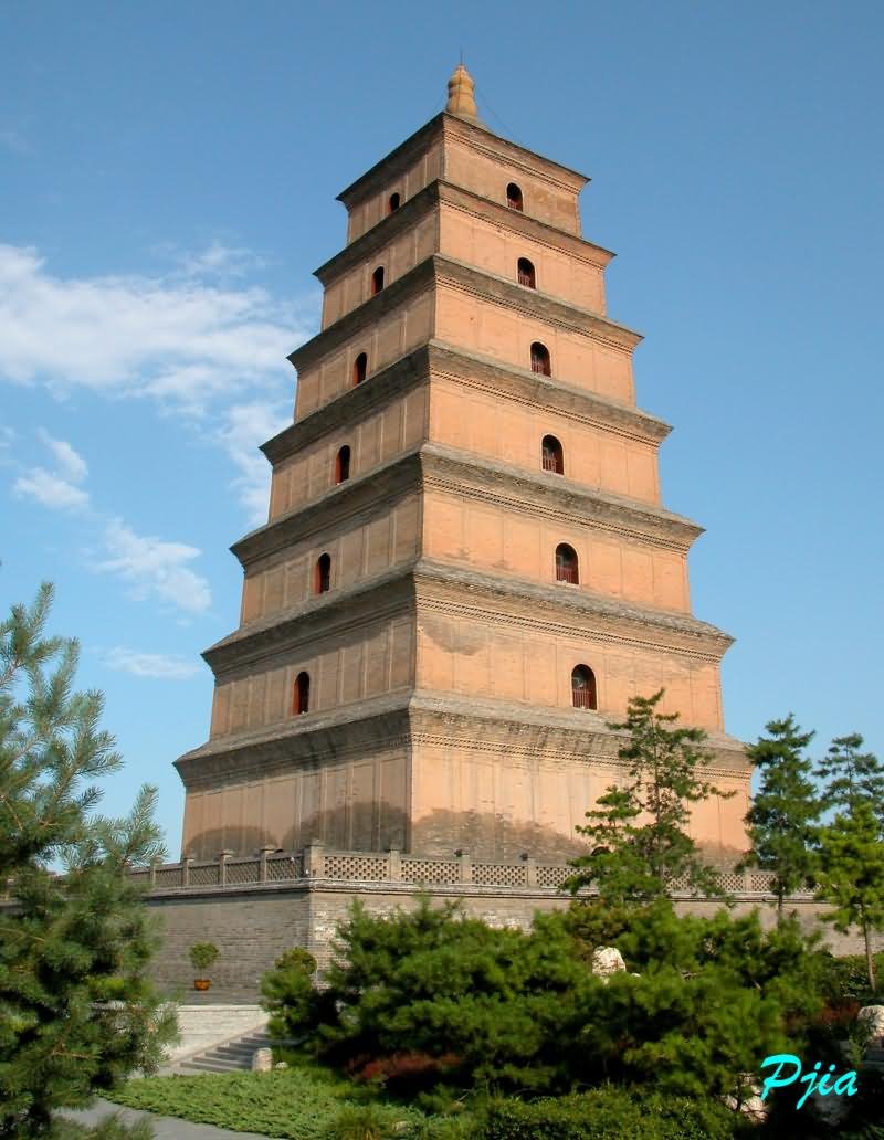 Description: A tall tower with a clock on the top of it's side in a park area with trees and bushes.