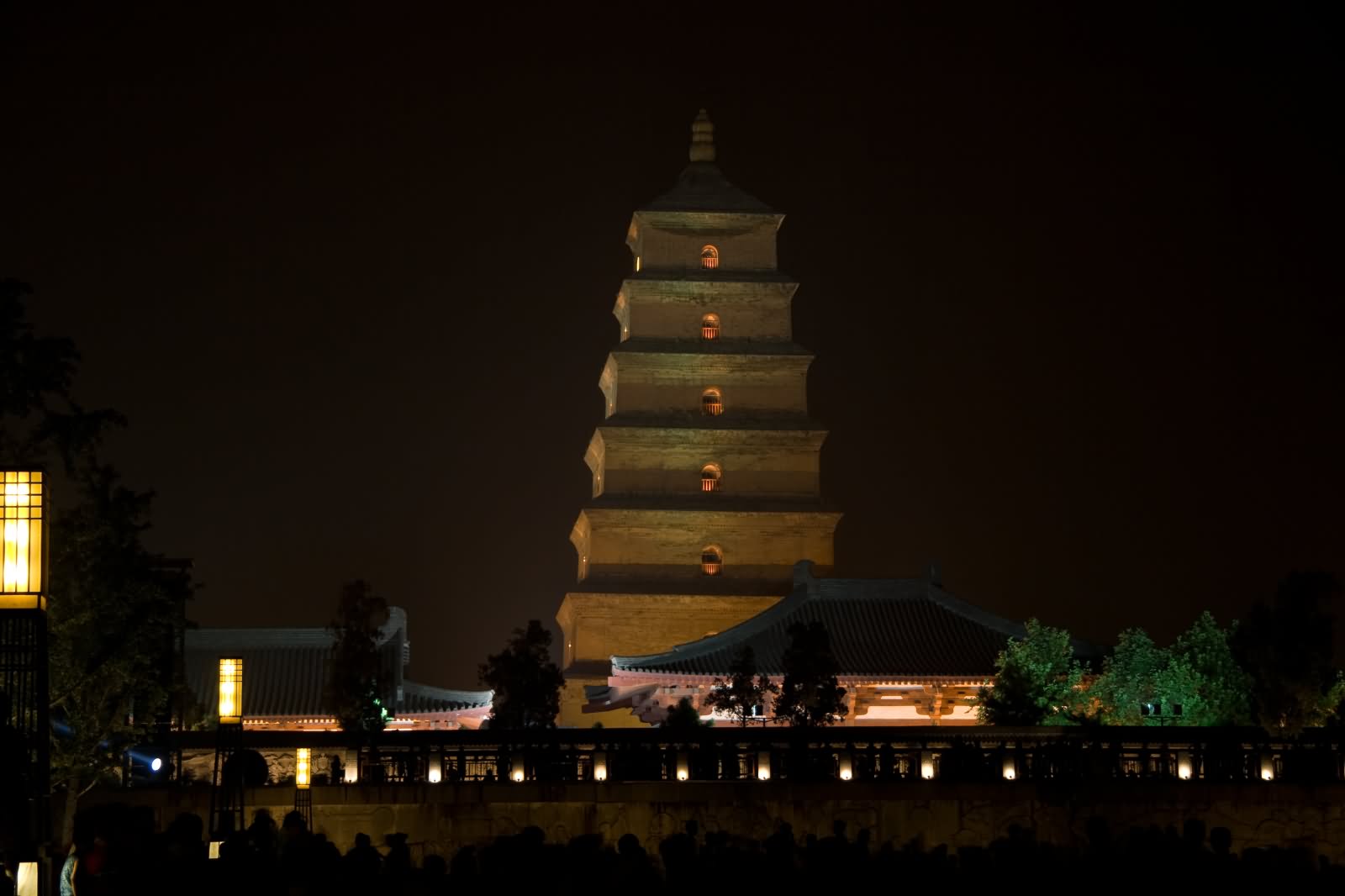 Description: A tall tower lit up at night with lights on it's sides and a clock on the top.