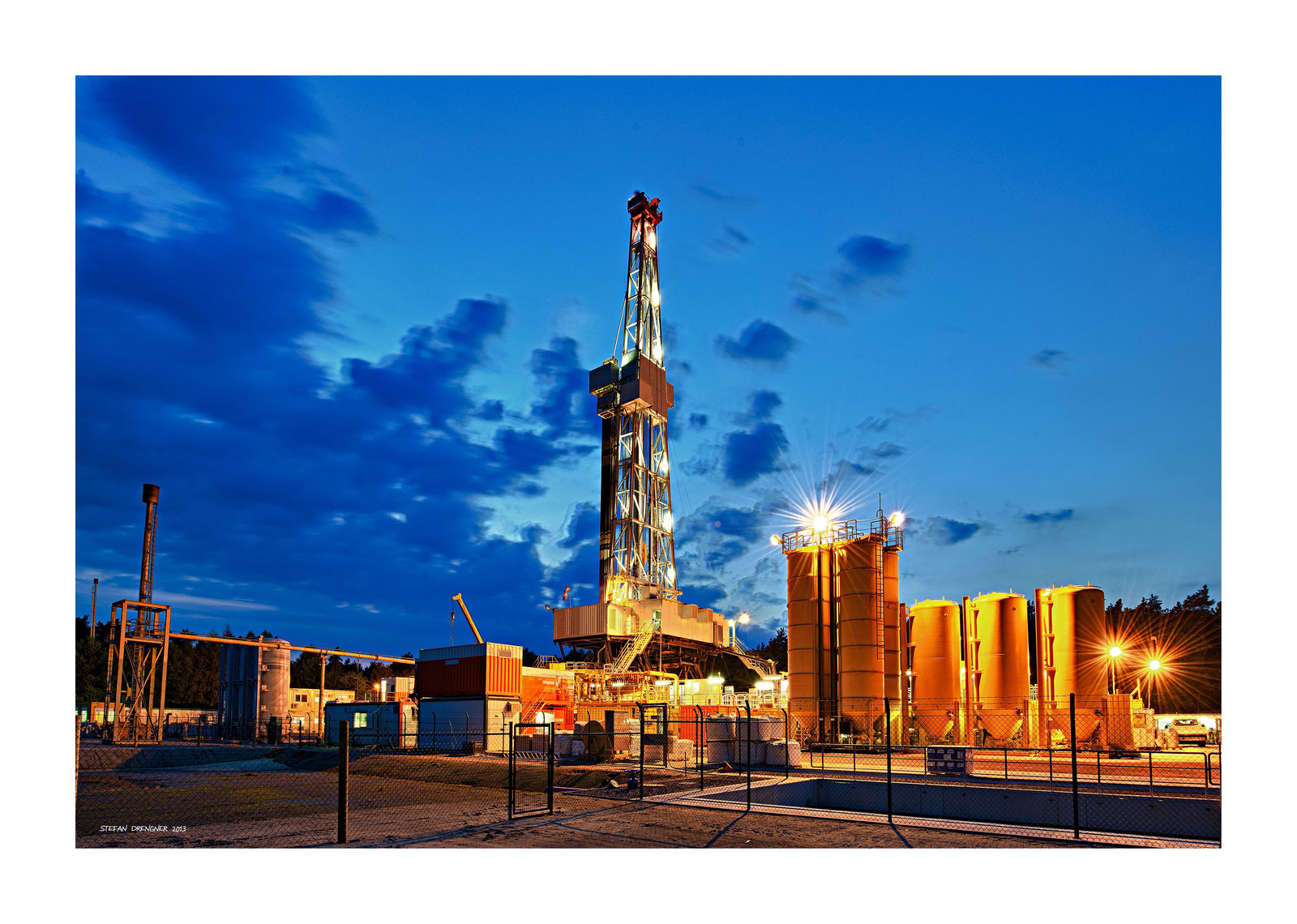 Description: A tall tower with a sky background and clouds in the background at night time with lights on it and a few buildings in the foreground.