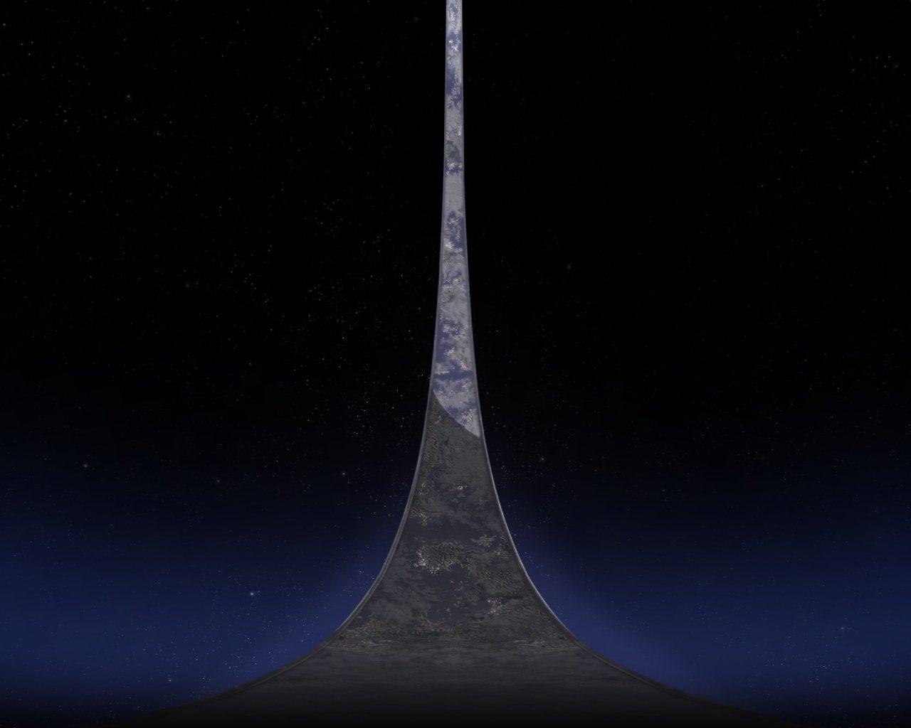 Description: A very tall tower with a sky background and stars in the sky above it.