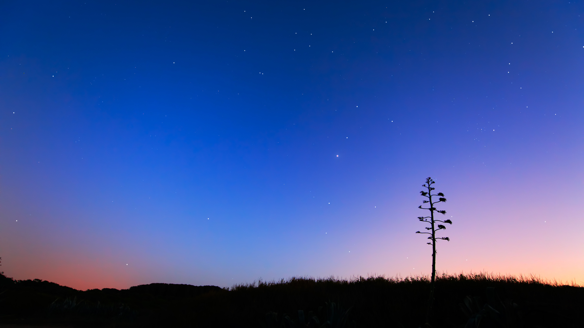 Description: A tall tree sitting on top of a grass covered field under a blue sky with stars above it and a field of tall grass.