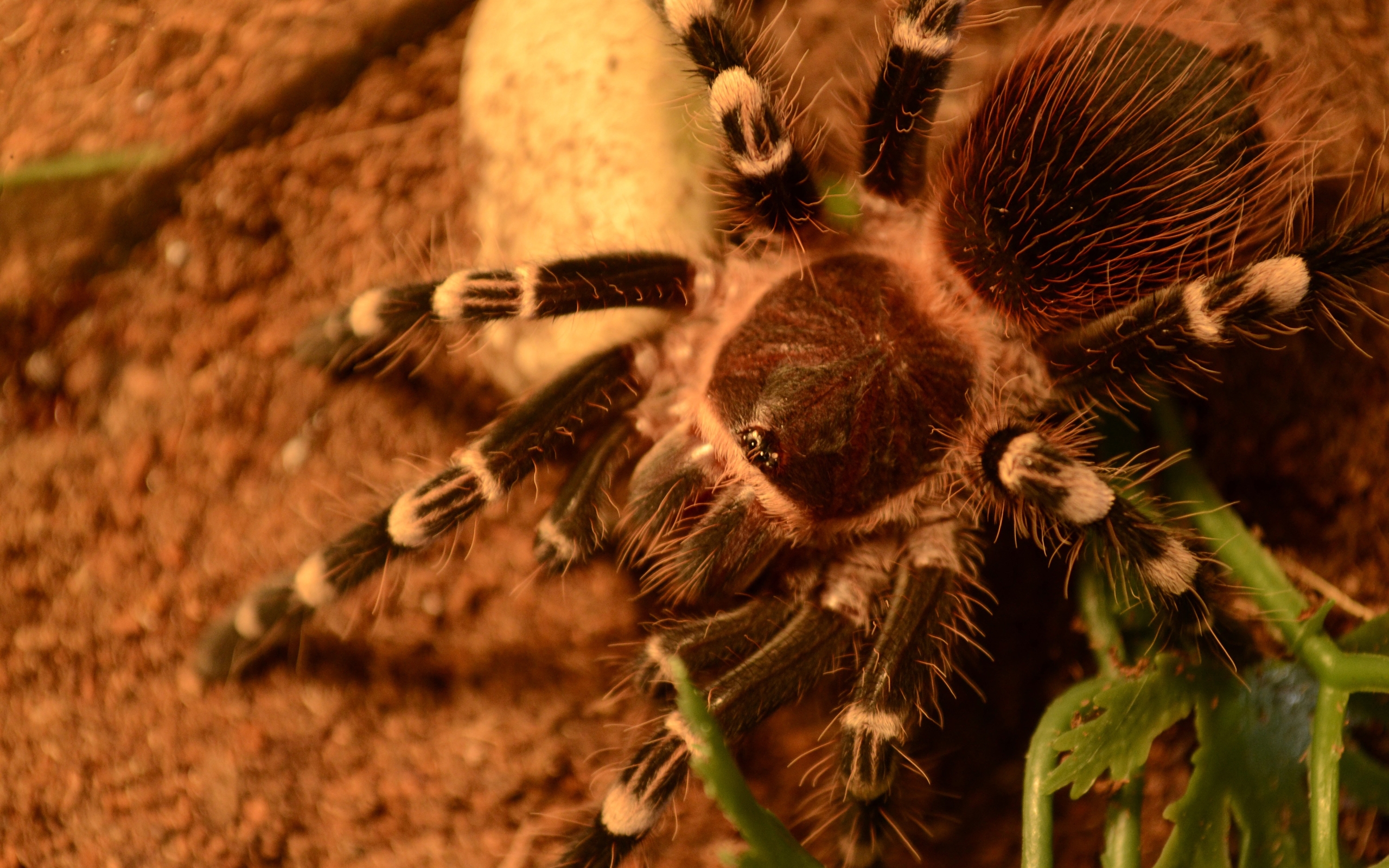 Description: A close up of a tarant spider on the ground with its head on a plant stem and a rock in the background.