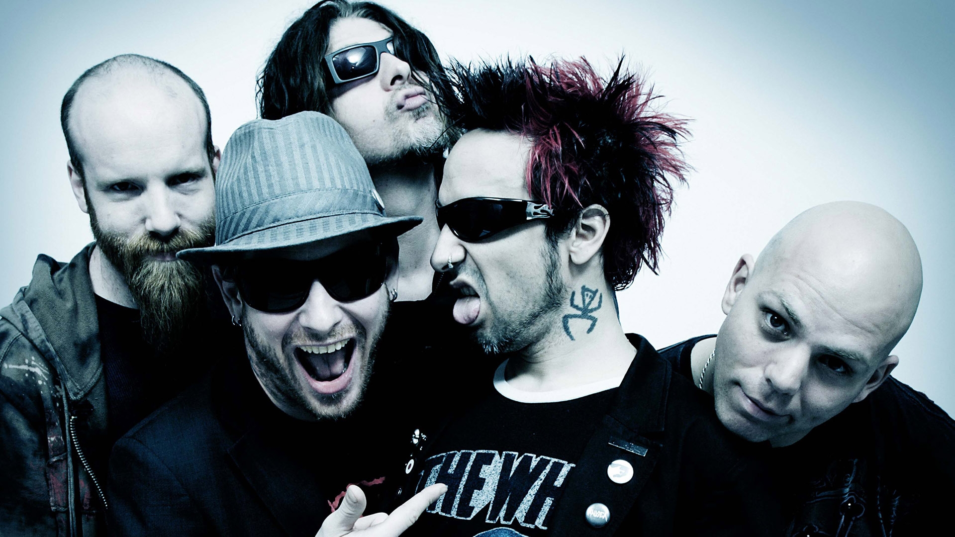 Description: A group of men with tattoos and piercings posing for a picture together with one man pointing at the camera.