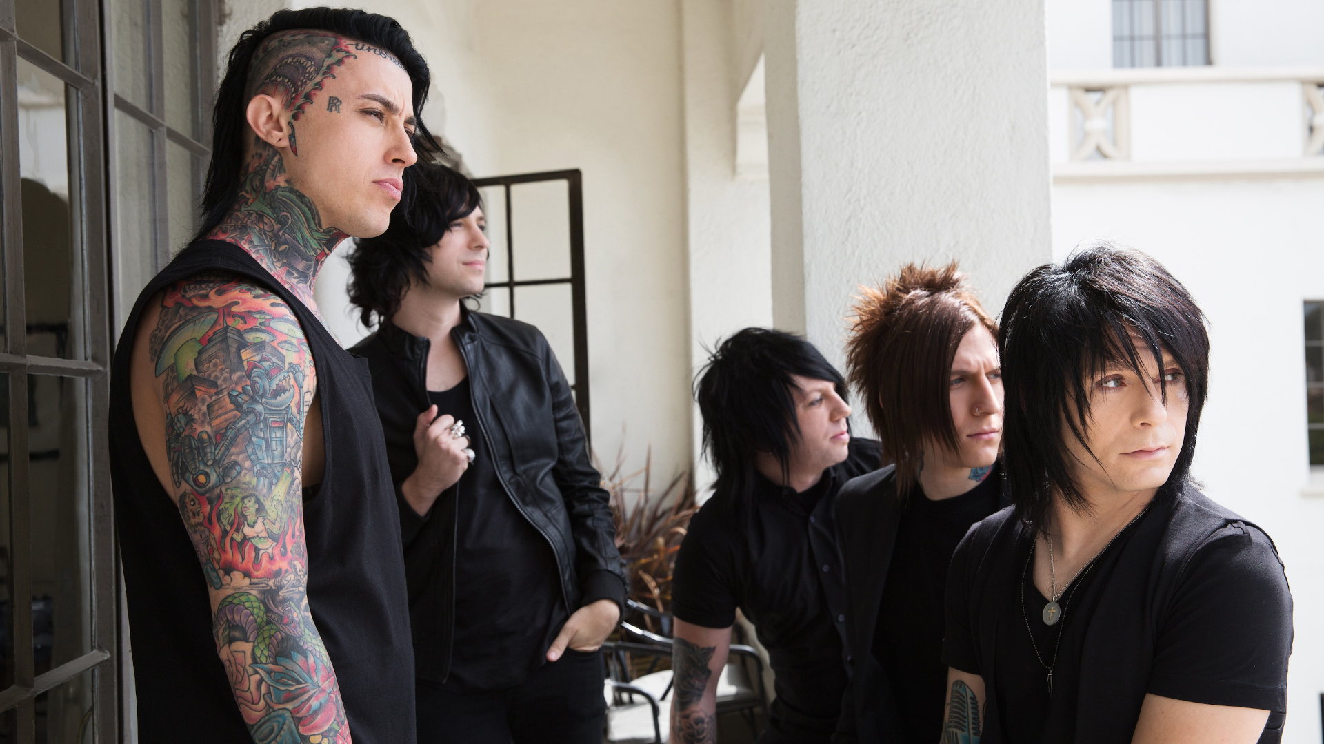 Description: A group of people with tattoos standing next to each other in front of a building with a door and windows.