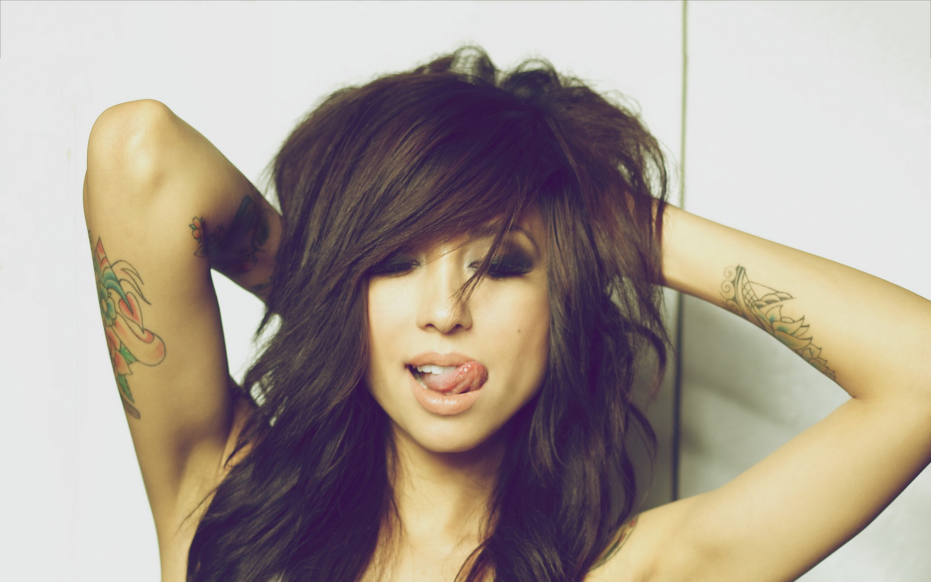 Description: A woman with tattoos on her arms and shoulder posing for a picture with her hands behind her head and her arm behind her head.
