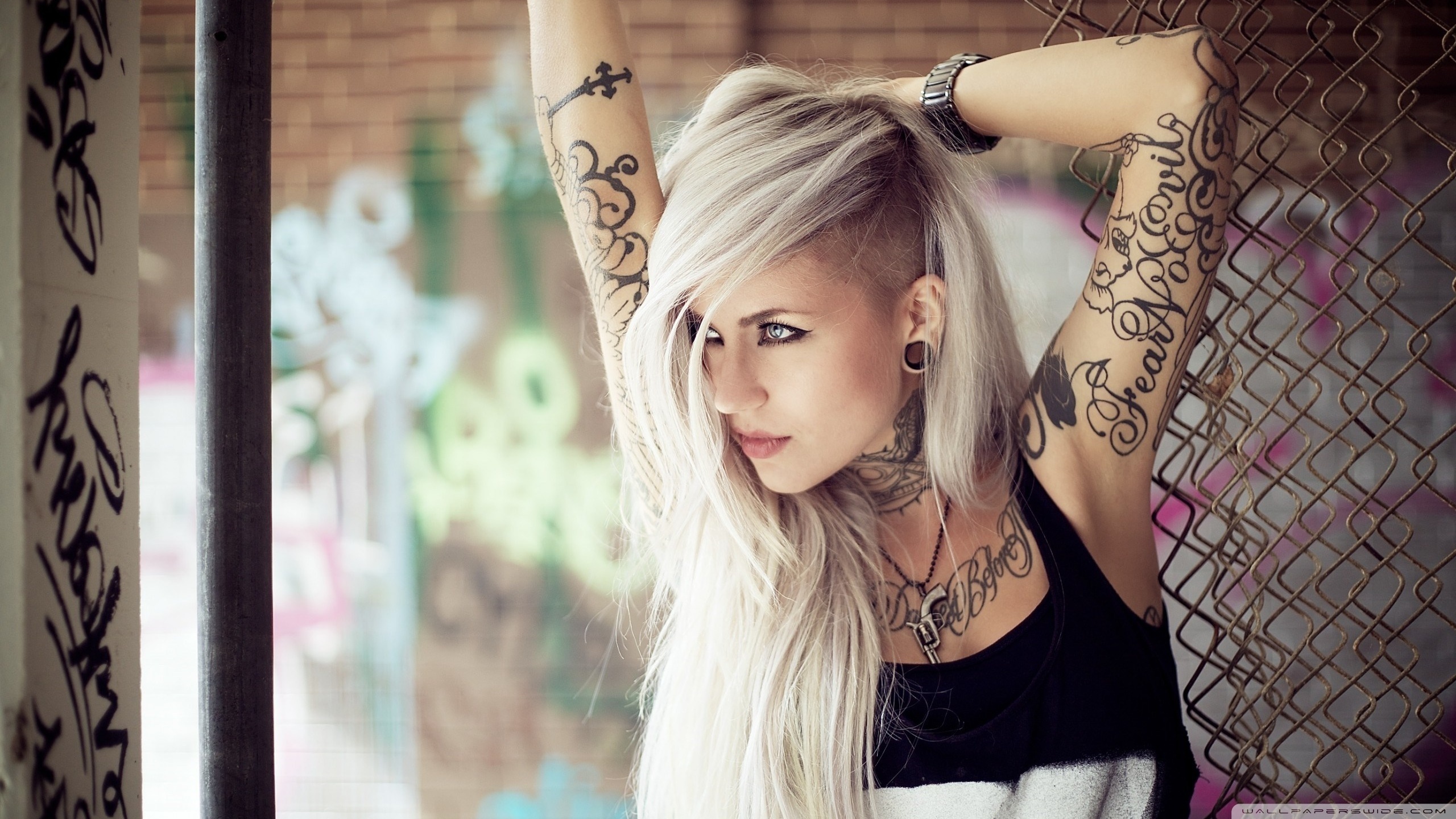 Description: A woman with tattoos on her arms and shoulder posing for a picture with her hands behind her head and her arm behind her head.