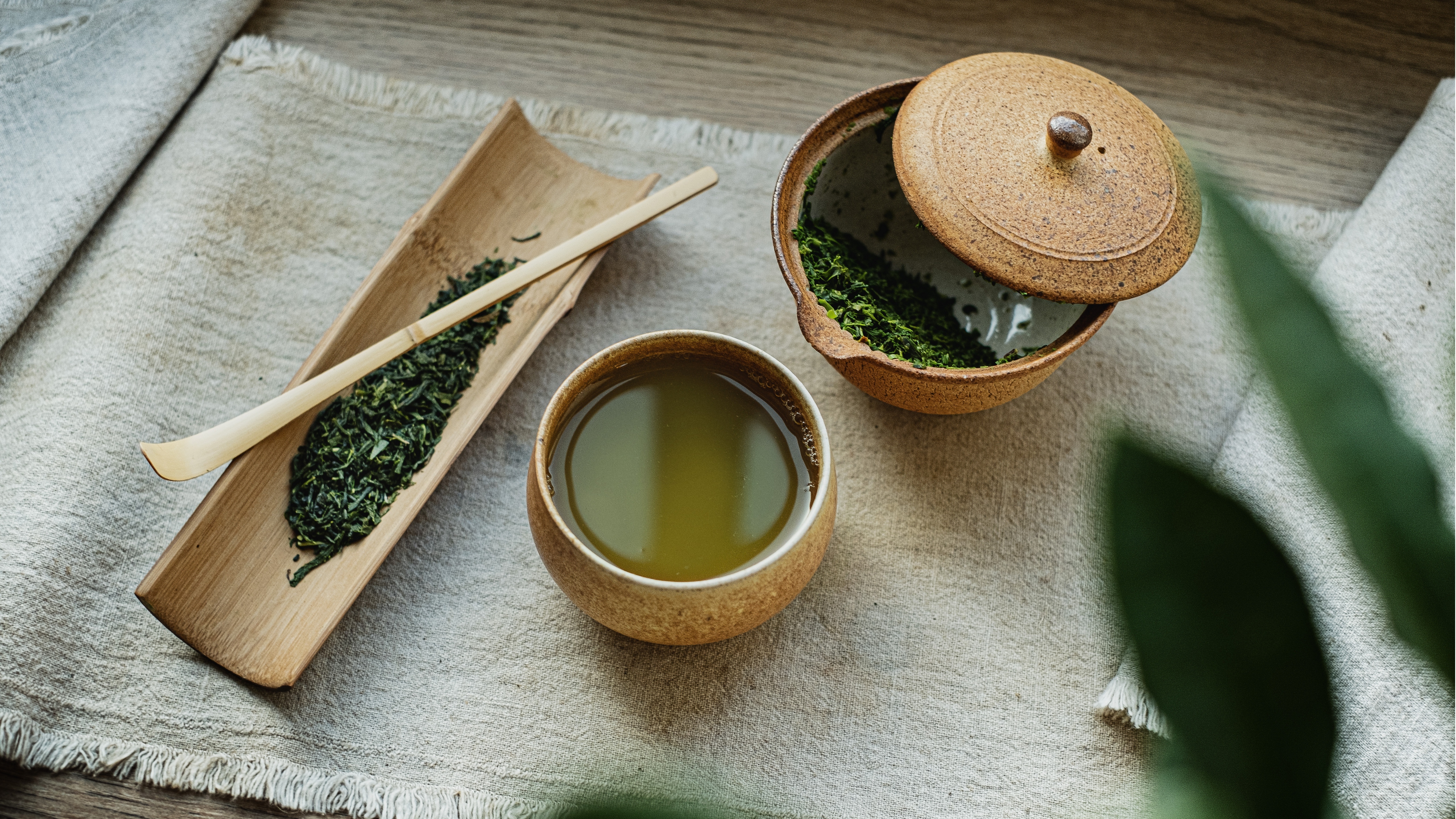 Description: A cup of tea and a wooden spoon on a towel with a wooden spoon rest on it and a wooden spoon rest on the side of the cup.