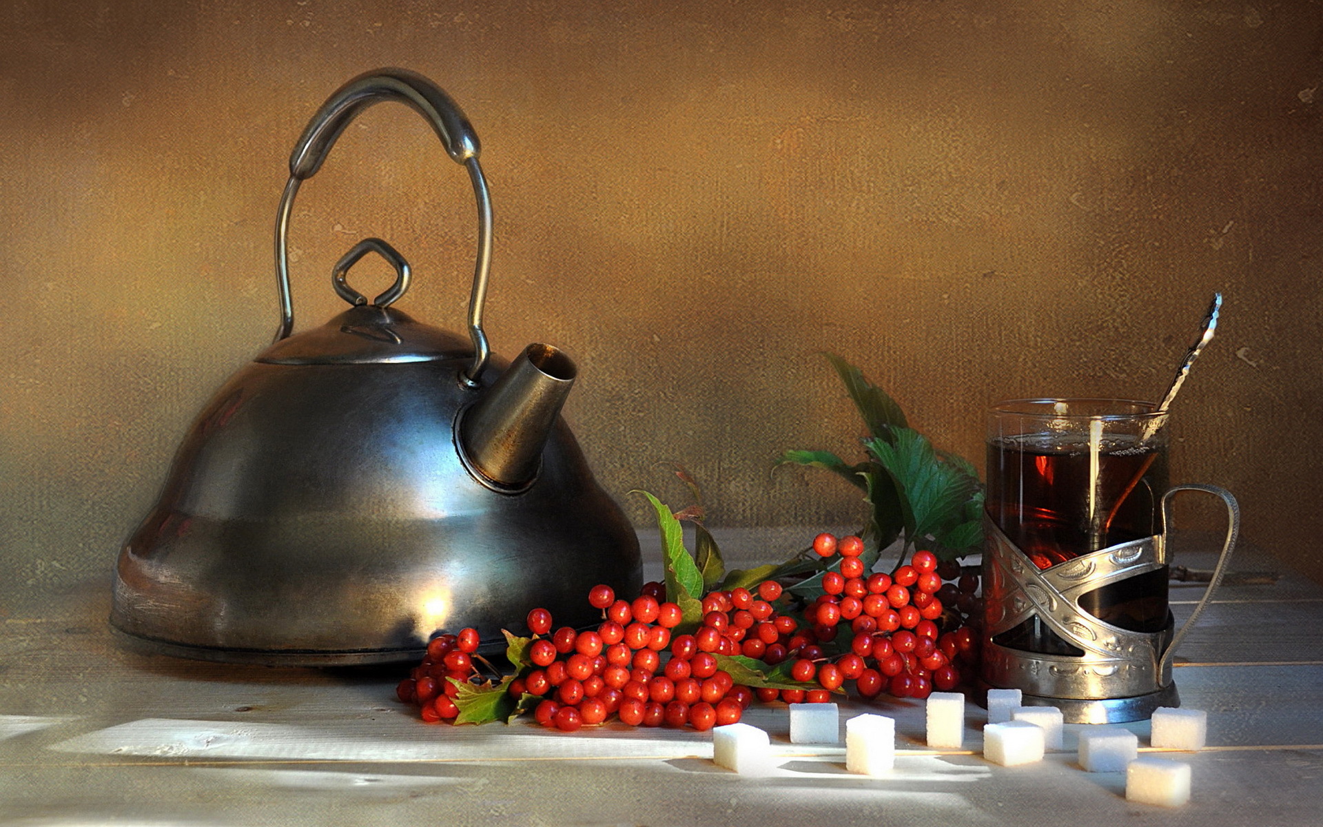 Description: A tea kettle and some candles on a table with a glass of tea and a candle holder on it.