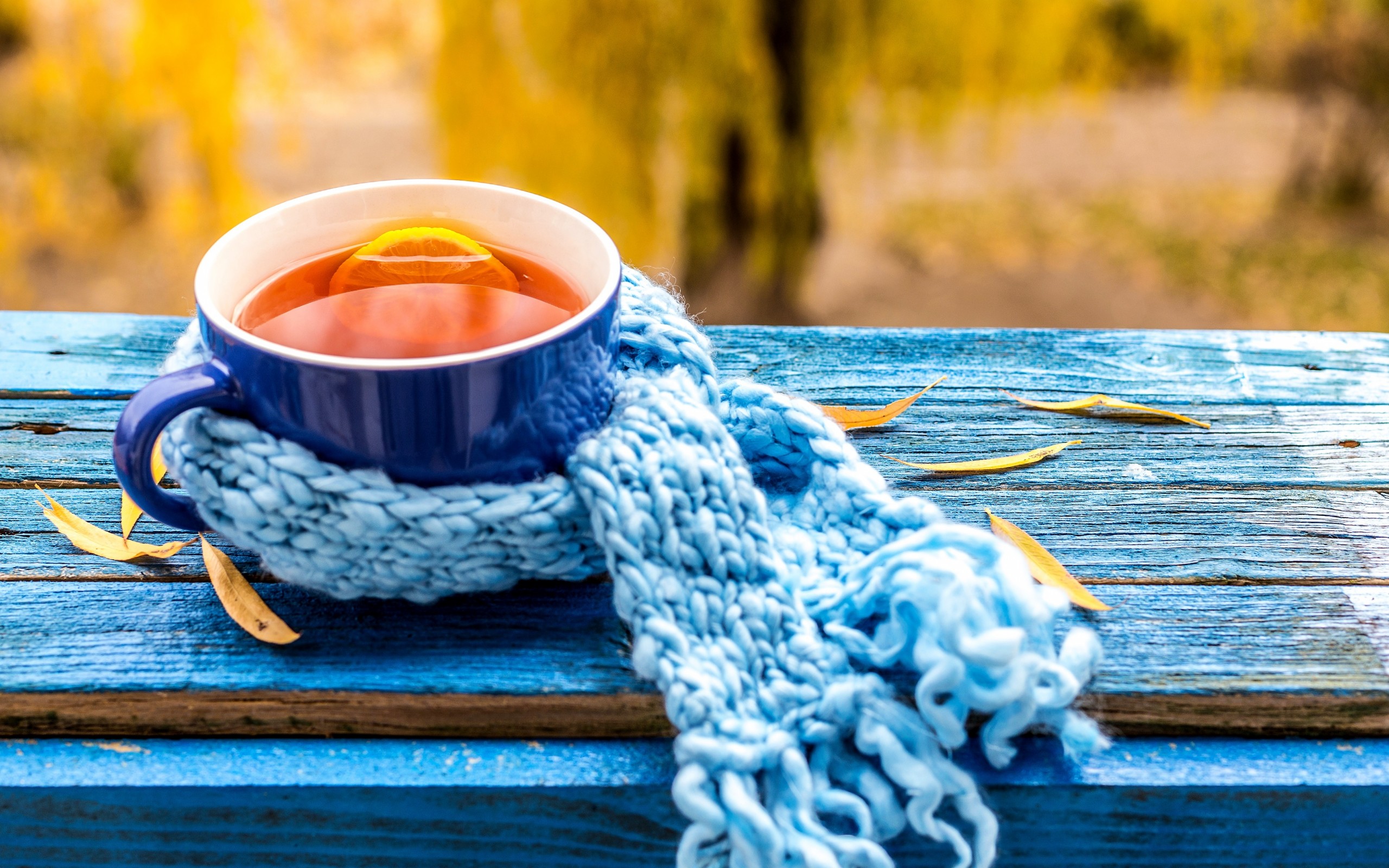 Description: A cup of tea with a blue knitted scarf on a wooden table outside in the sun with a blurry background.