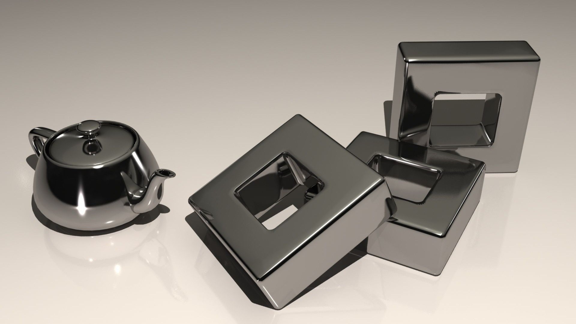 Description: A tea pot and a kettle on a white surface with a reflection of the teapot on the floor.