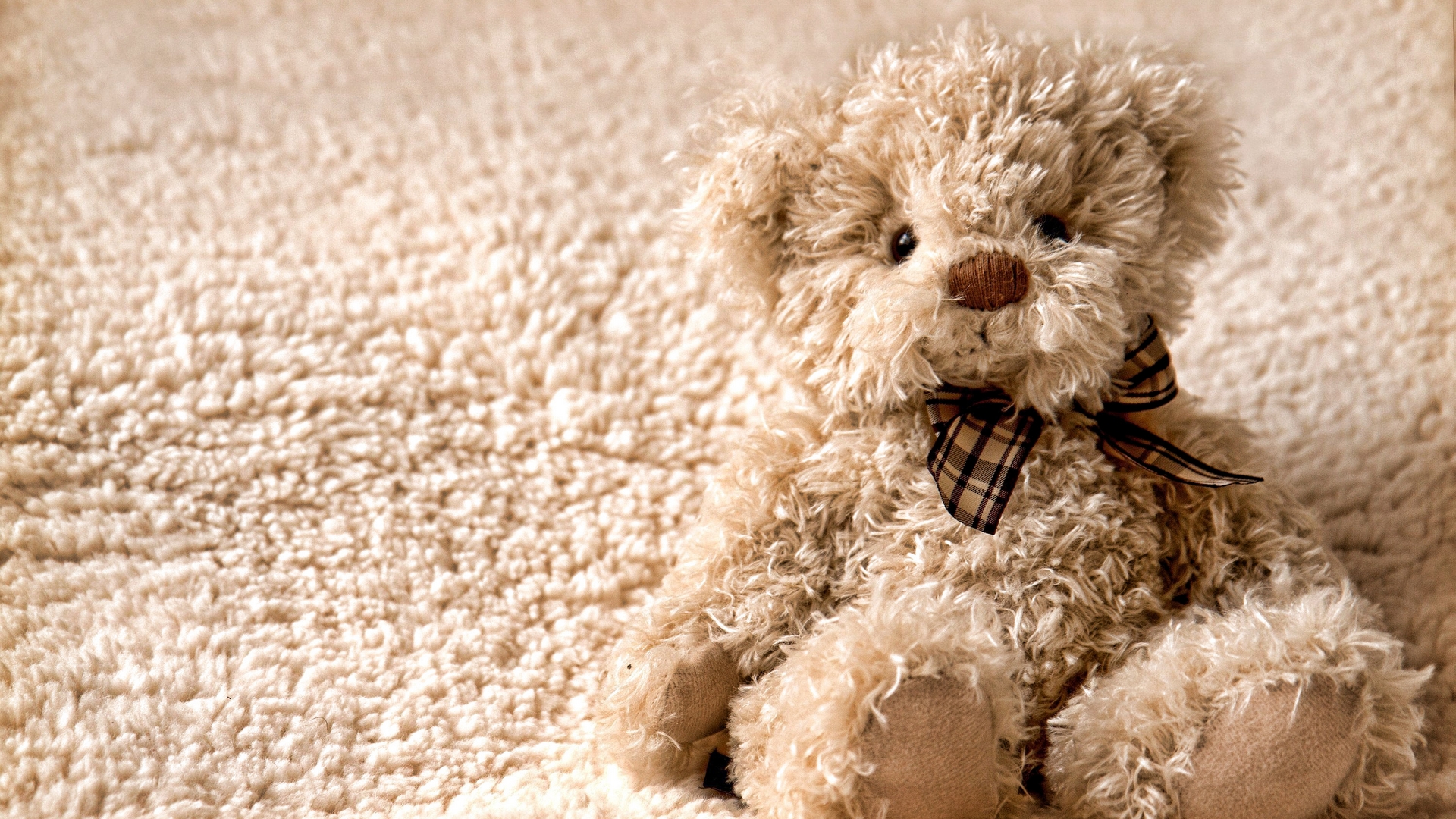 Description: A teddy bear sitting on a white carpet with a bow tie on it's neck and eyes closed.