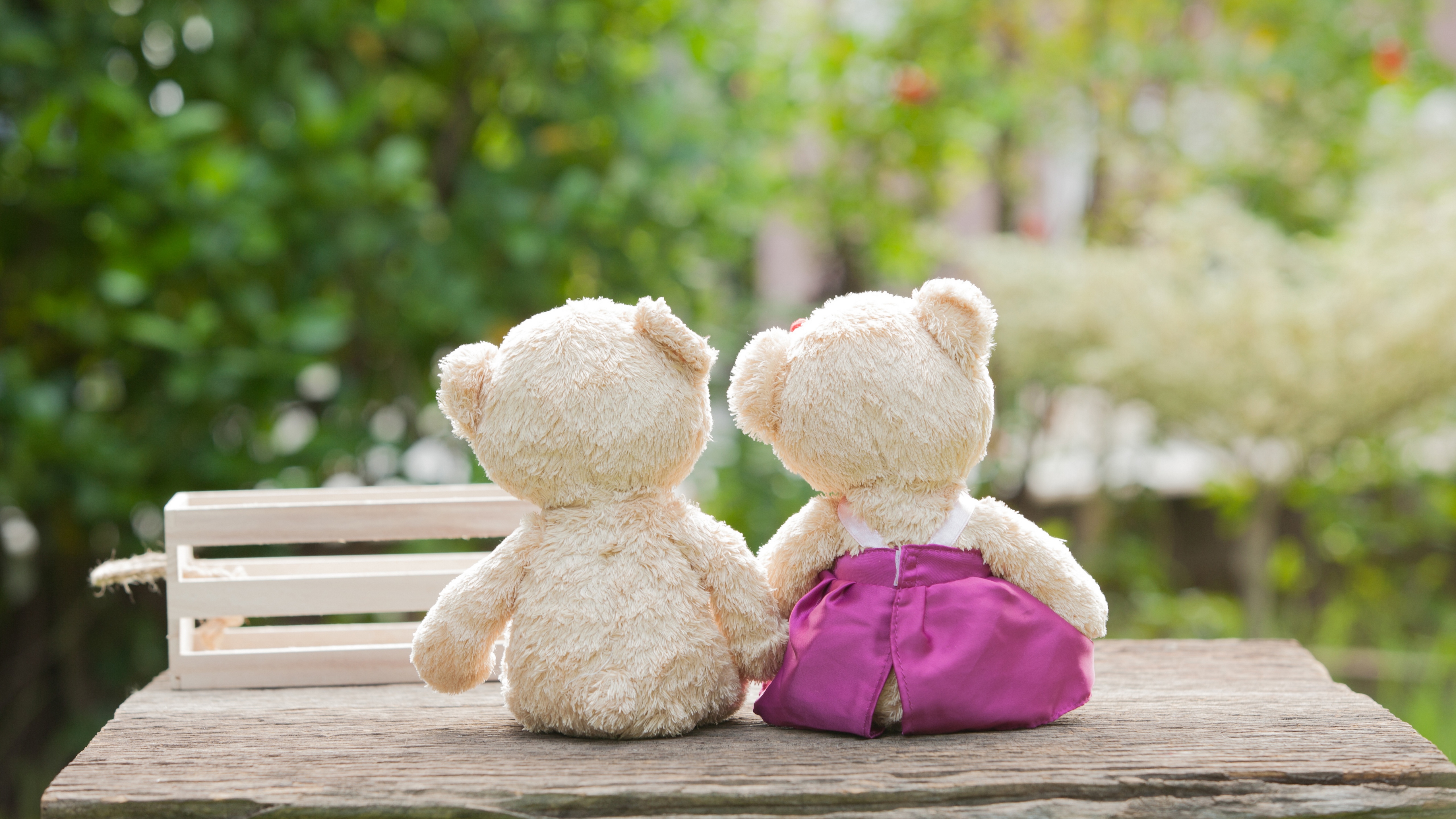 Description: Two teddy bears sitting on a bench with a purple bag on it's lap.