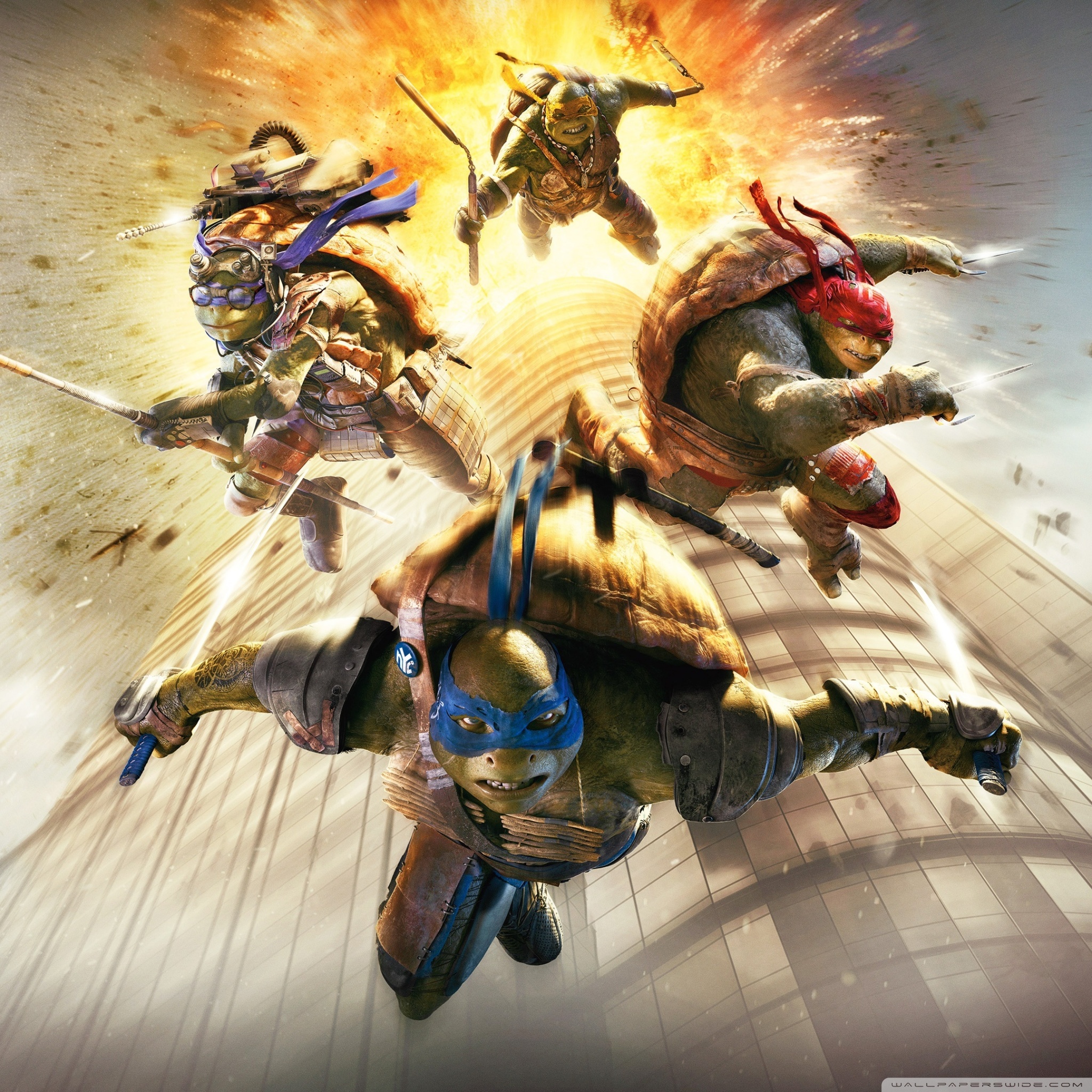 Description: A group of teenage mutant ninja turtles in a battle with each other in a video game poster style image.