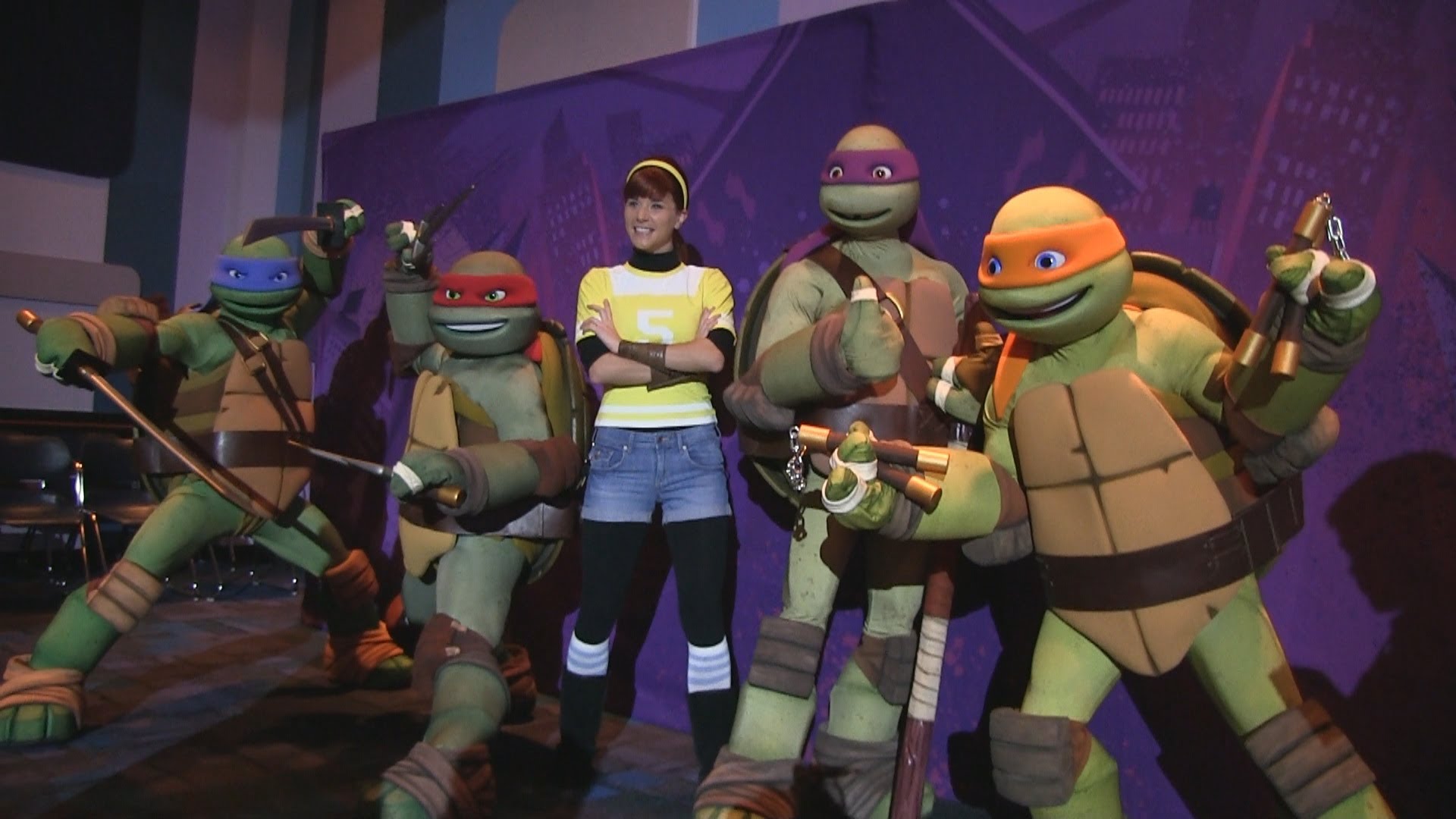 Description: A group of teenage mutant teenage girls standing next to each other in front of a purple backdrop with a teenage mutant teenage girl.