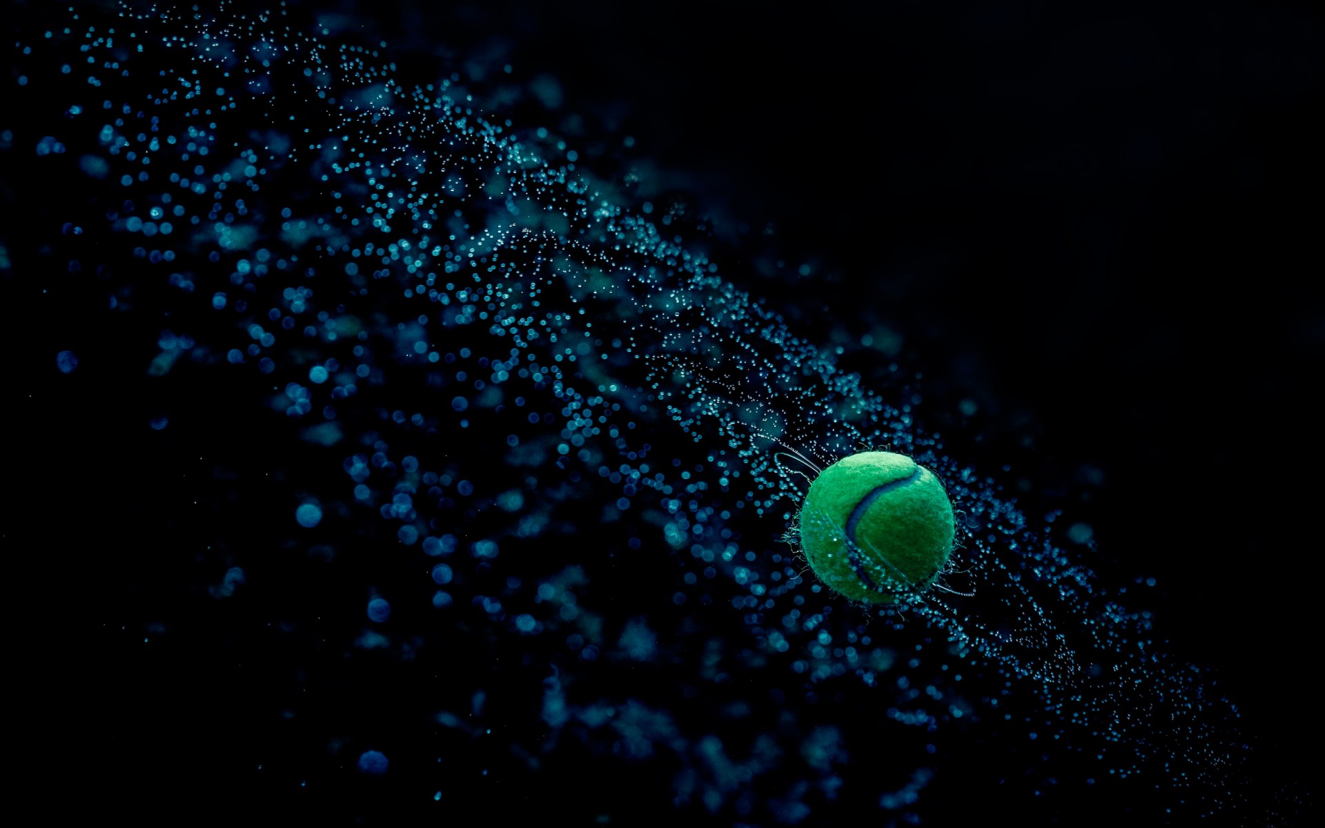 Description: A tennis ball is floating in the air with bubbles of water on it's surface and a black background.