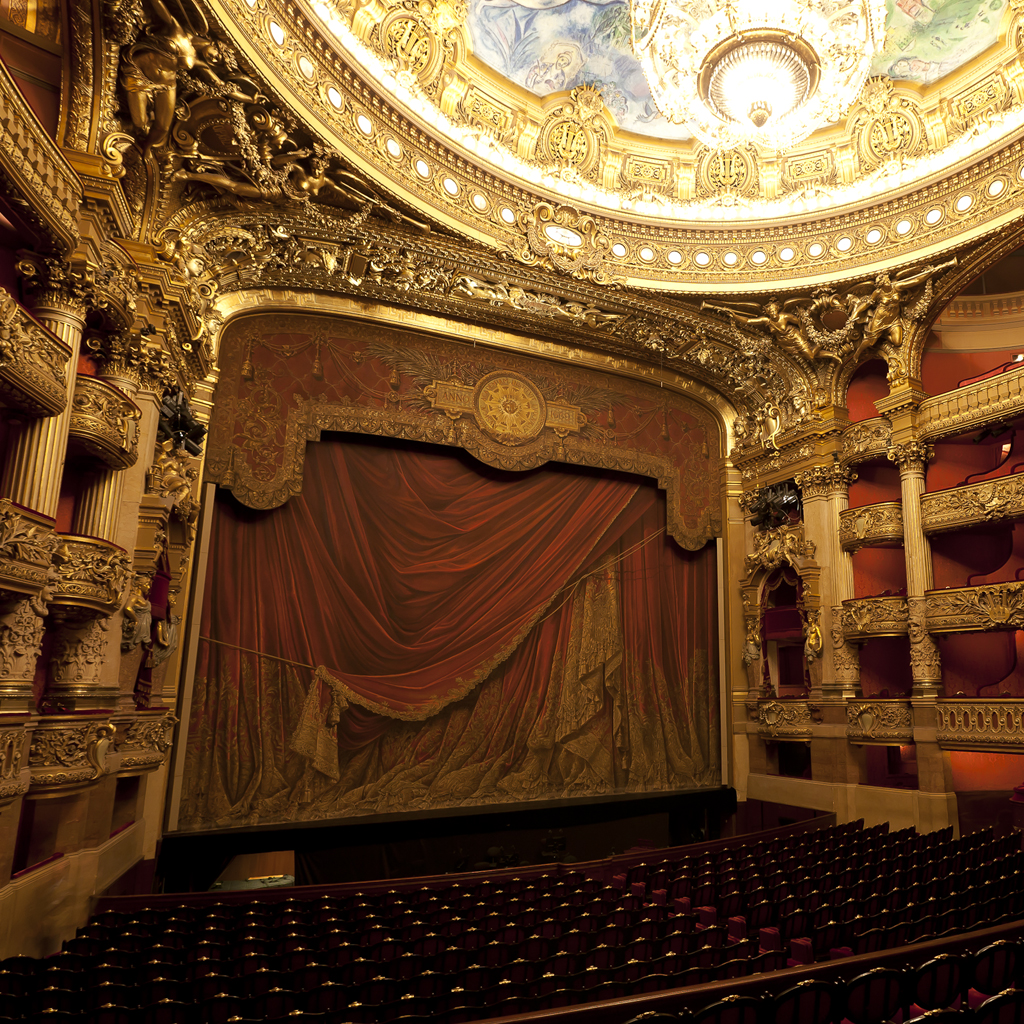 Description: A theater with a curtain and a stage with a clock on it's side and a ceiling with a painted mural.