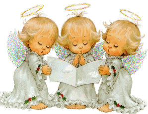 Description: Three angels reading a book together with angel wings on their heads and wings on their heads.