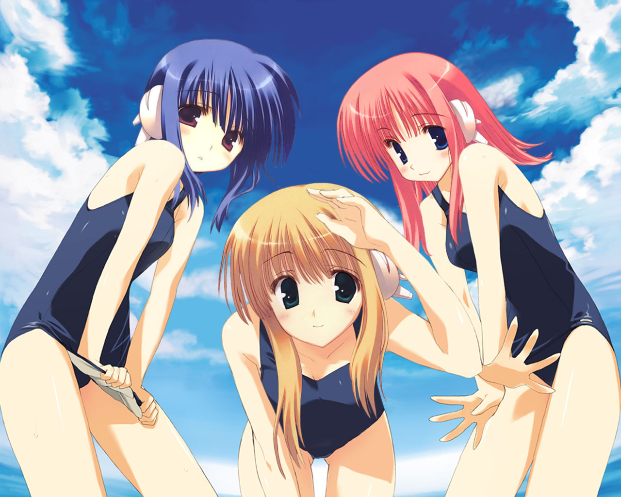 Description: Three anime girls in bathing suits are posing for a picture together in the water with a blue sky in the background.
