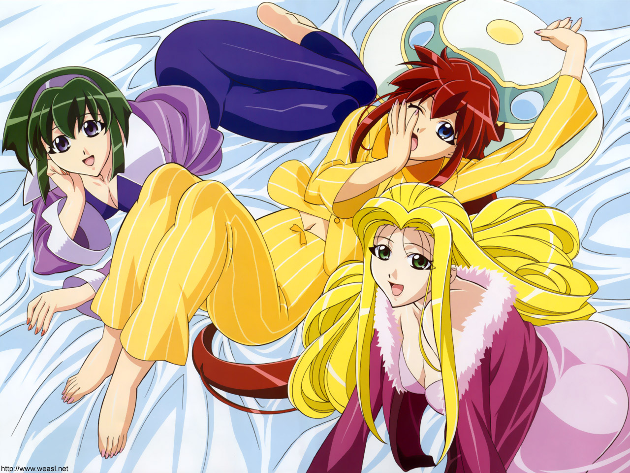 Description: Three anime girls laying on a bed with their arms around each other and one of them is holding a ball.