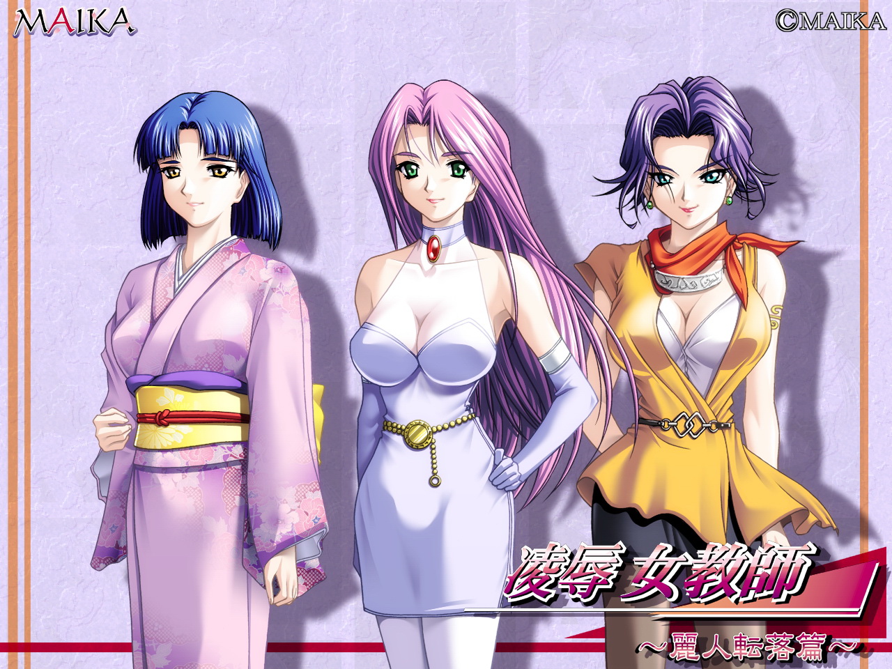 Description: Three anime girls in different outfits standing next to each other with long hair and wearing jewelry on their heads.