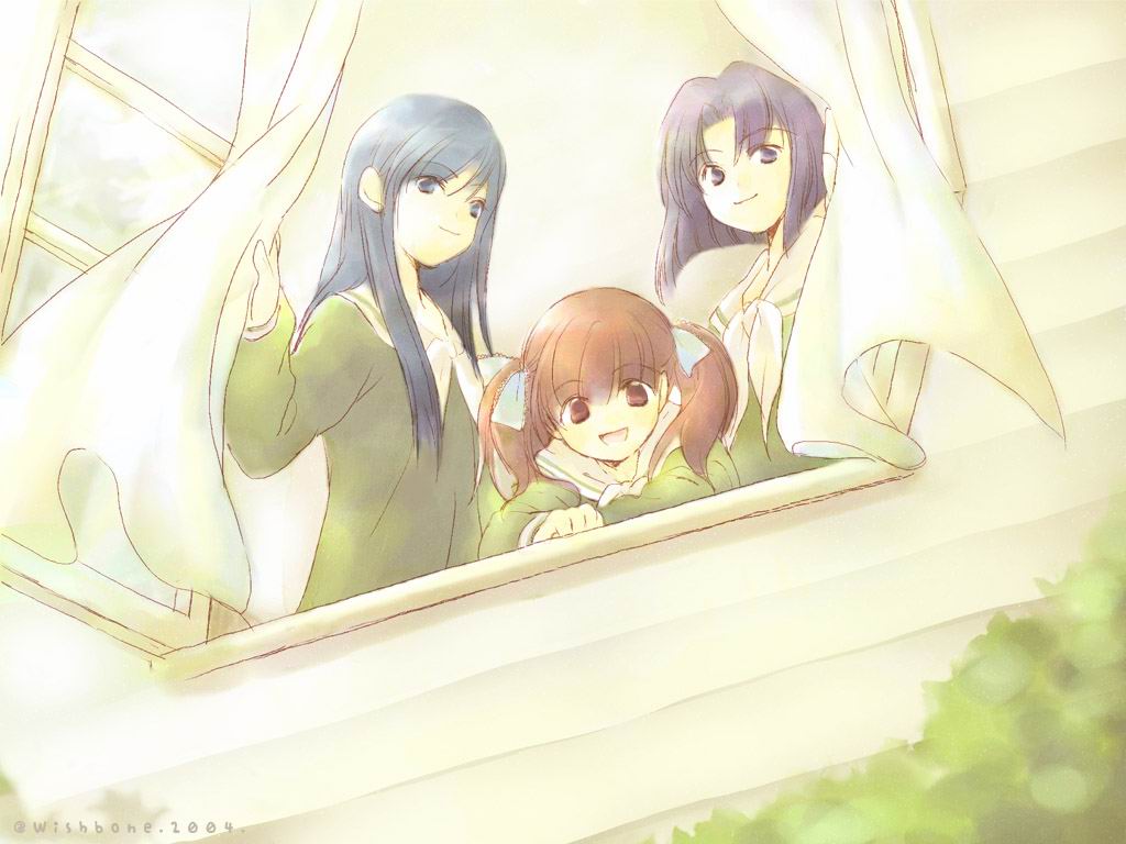Description: Three anime girls looking out a window at the scenery outside of them.