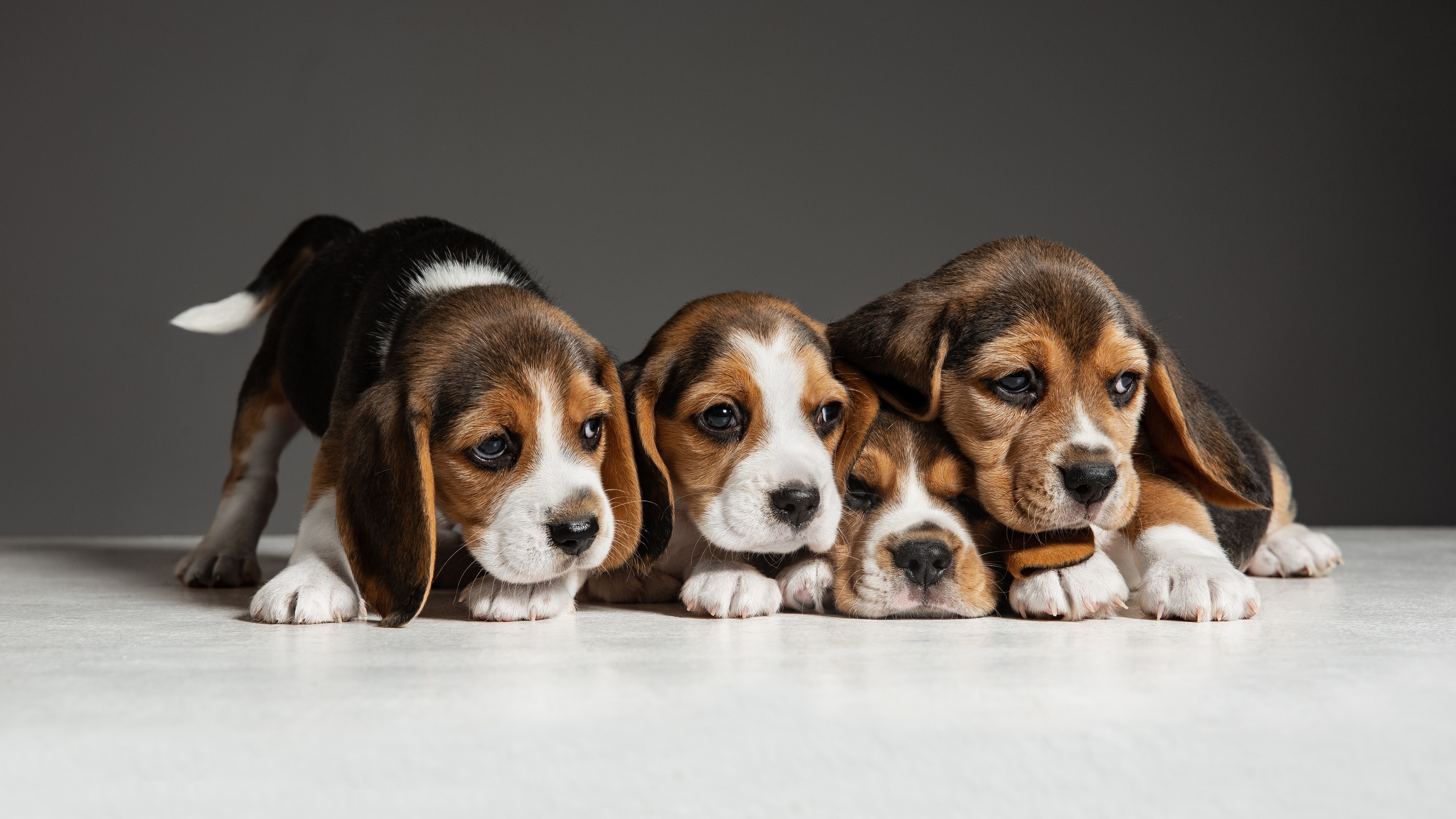 Description: Three beagles are standing next to each other on a white surface and one is looking at the camera.