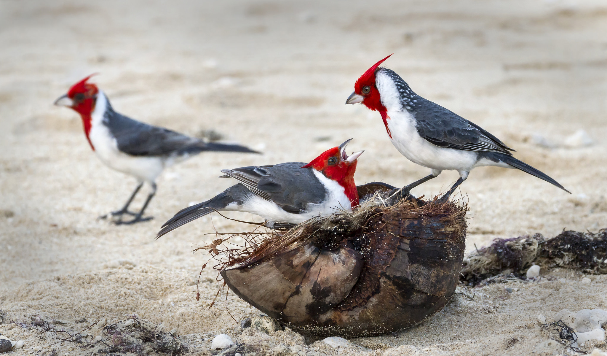Description: Three birds standing on a piece of wood on the beach with sand and shells around them and one bird has its beak open.