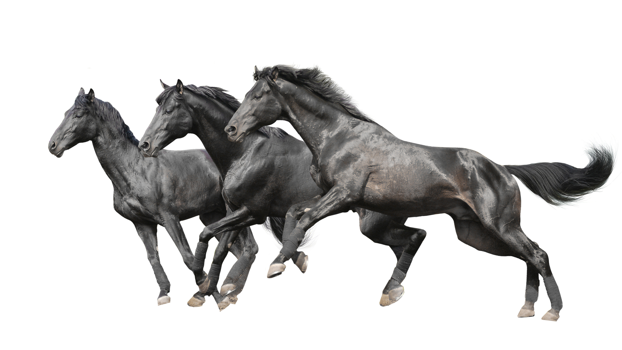 Description: Three black horses running in the air together on a white background with a white background behind them and a white background with a black horse running in the air.