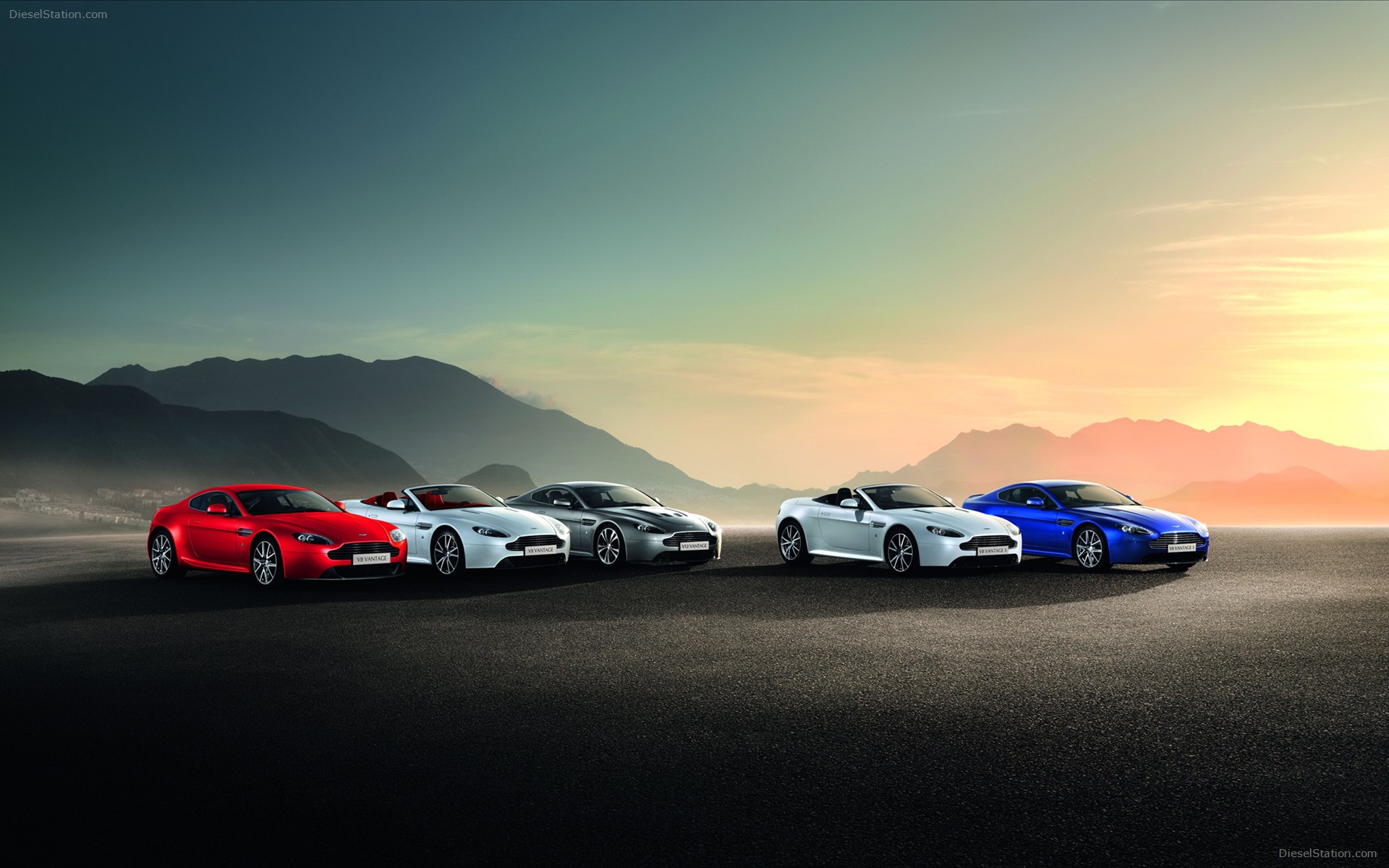Description: Three different colored sports cars parked in a row on a road with mountains in the background at sunset or dawn.