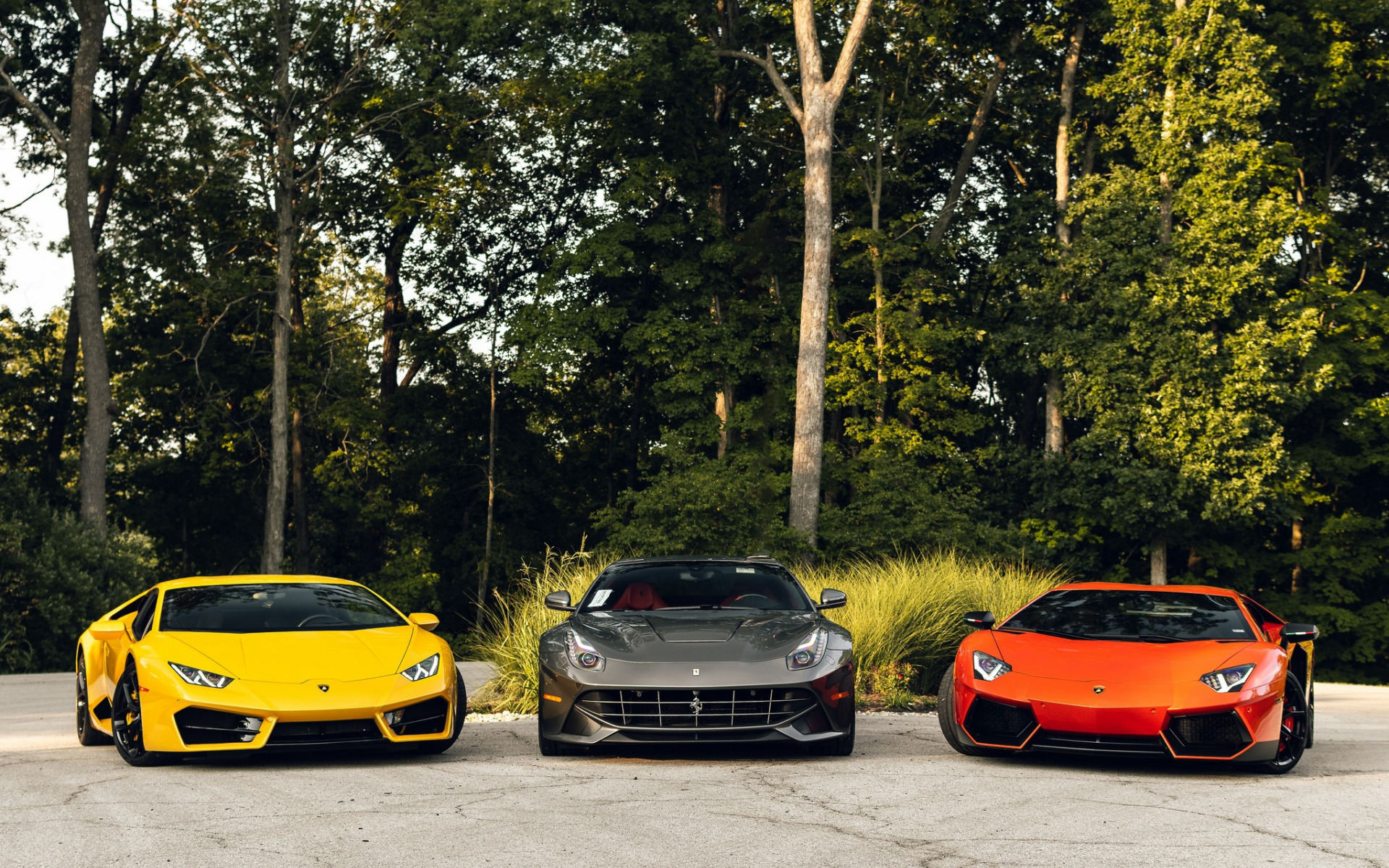Description: Three different colored sports cars parked in a parking lot next to trees and bushes.