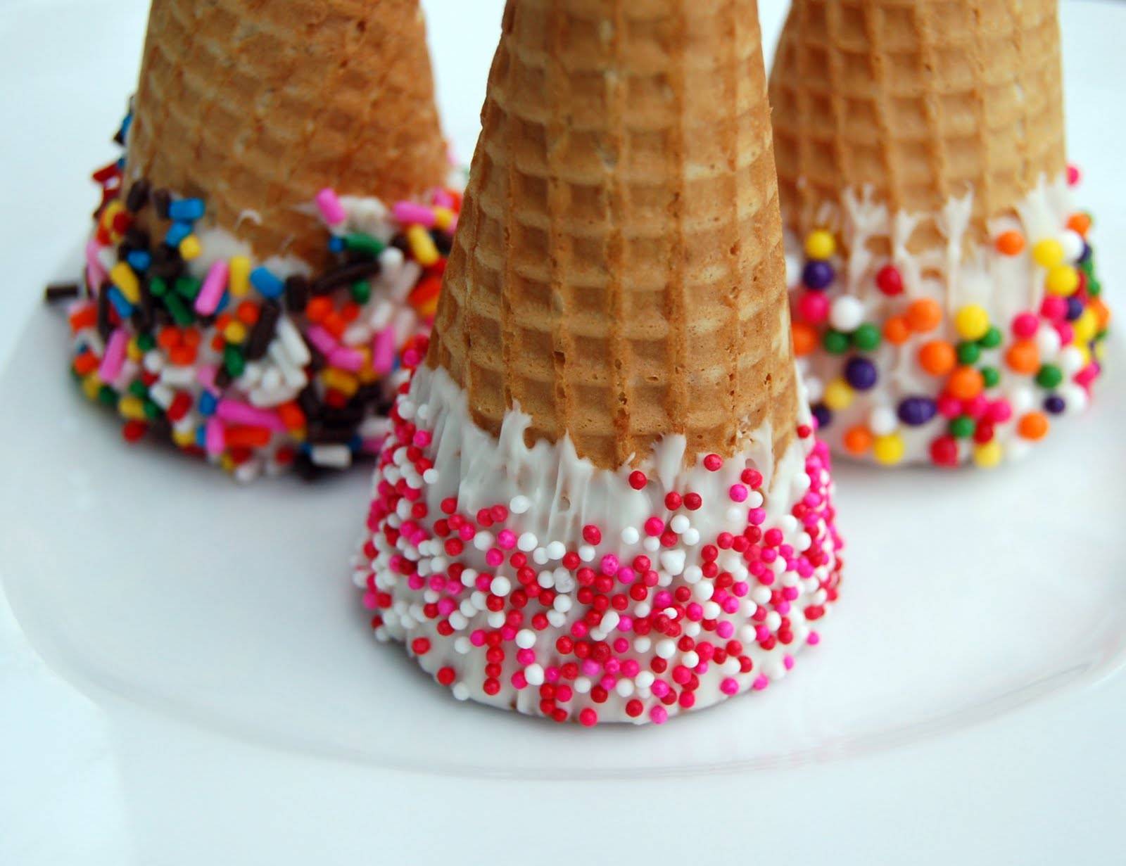 Description: Three cones with sprinkles and candy on them on a plate with a fork and knife in the background.