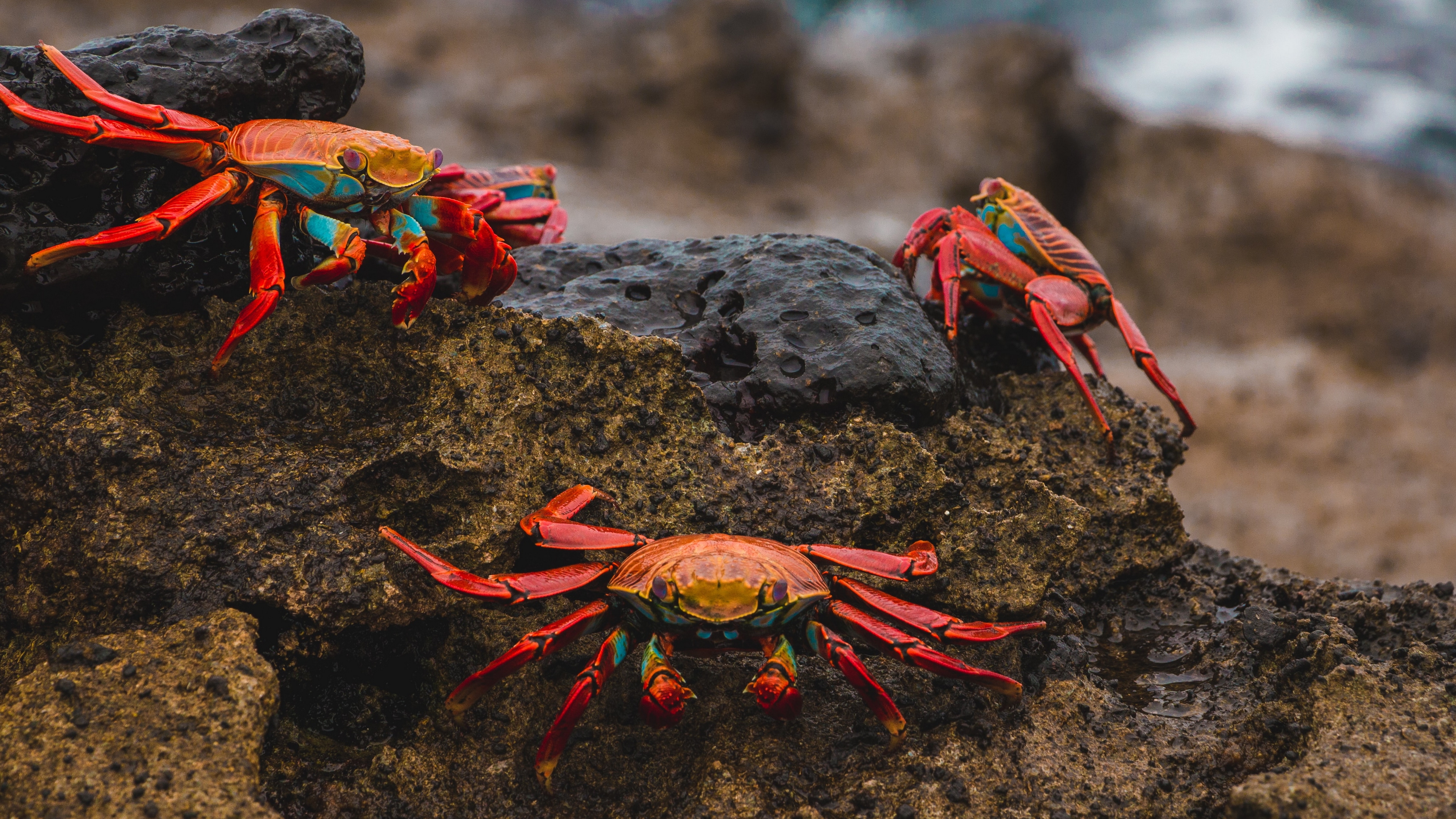 Description: Three crabs on a rock near the ocean water and rocks with a wave coming in from the ocean behind them.